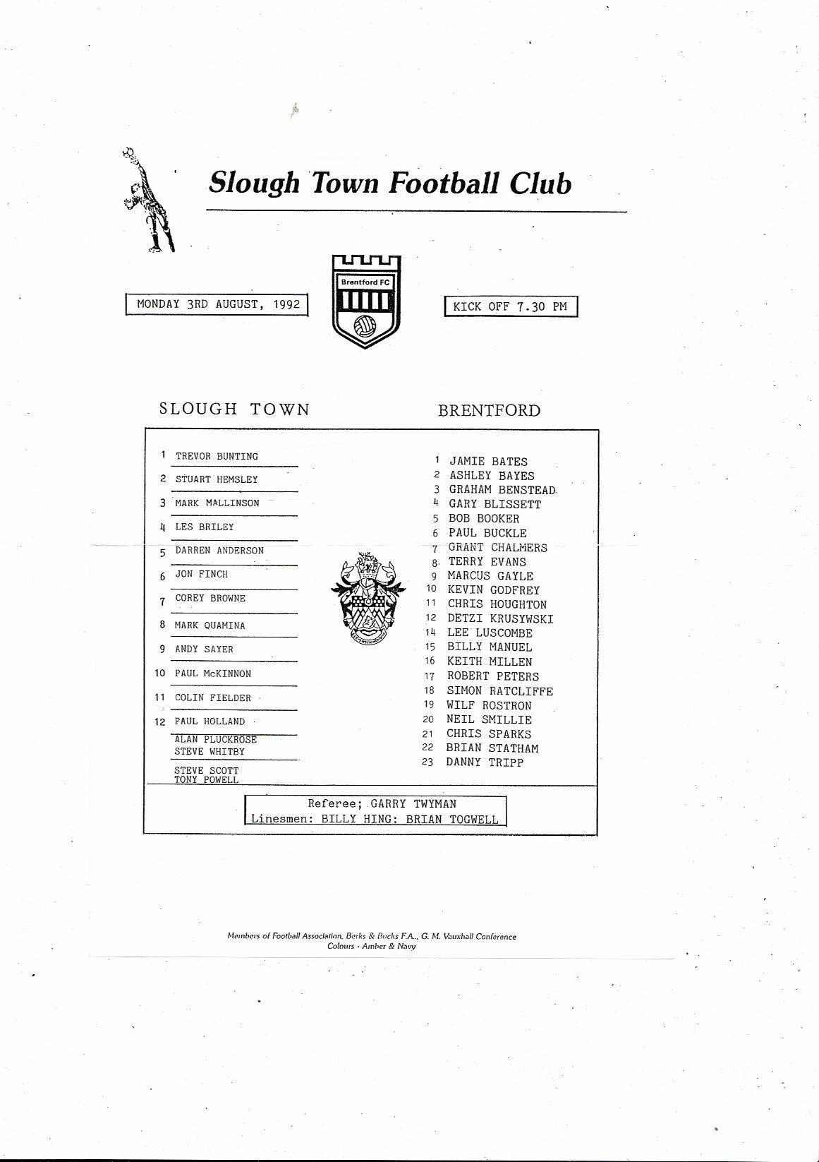 Slough Town v Brentford Friendly Football Programme 1992/93
