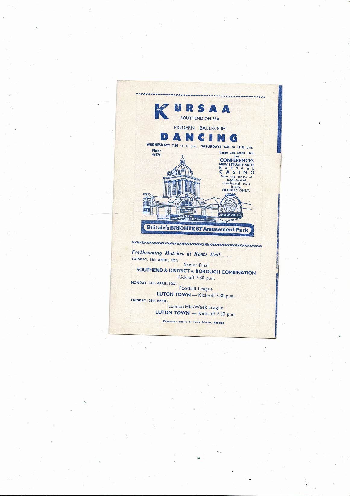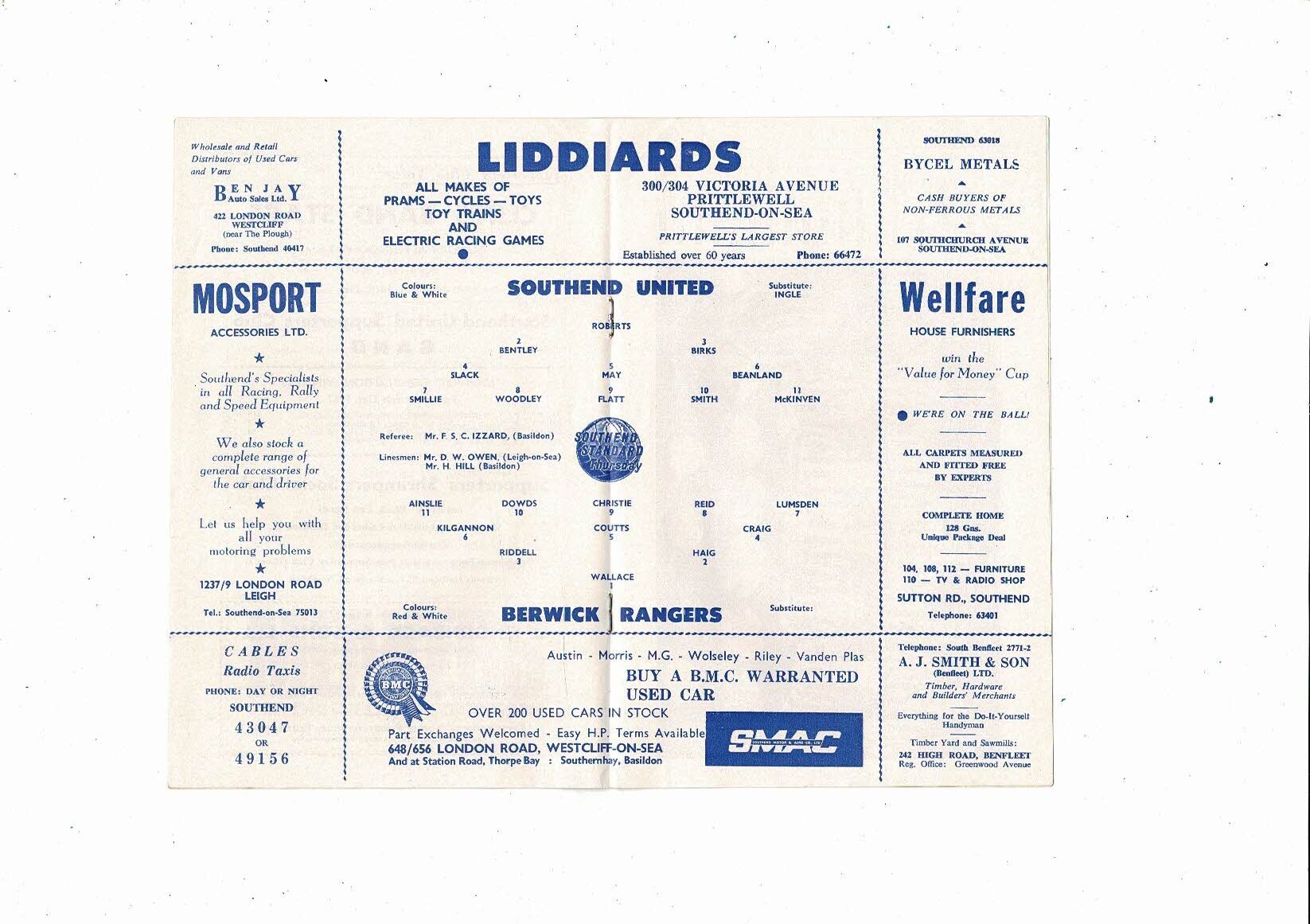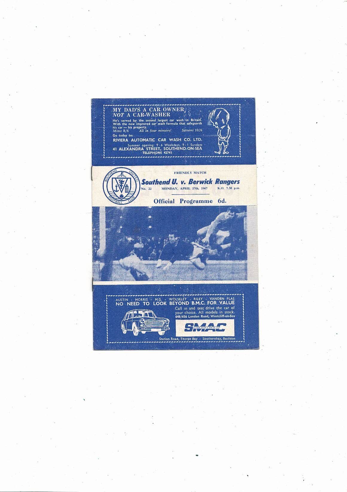 Southend United v Berwick Rangers Friendly Football Programme 1966/67