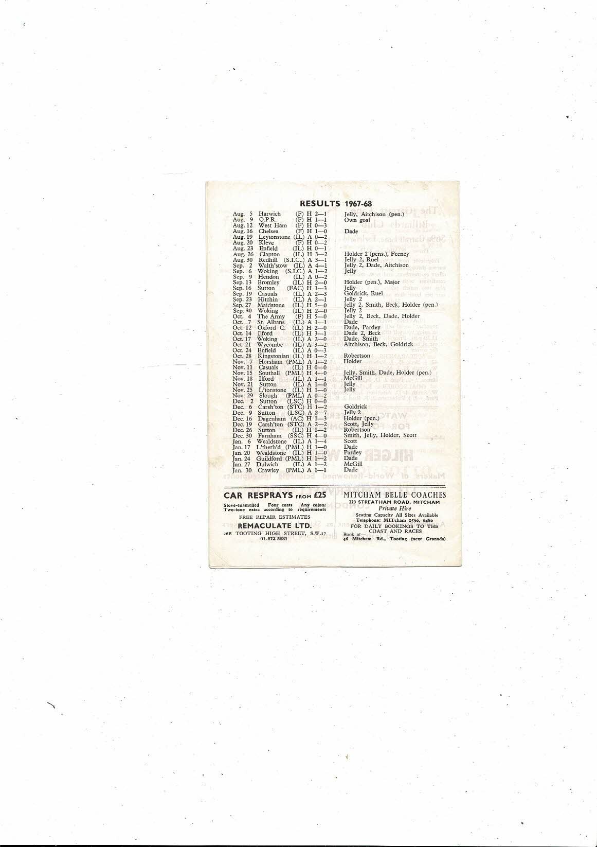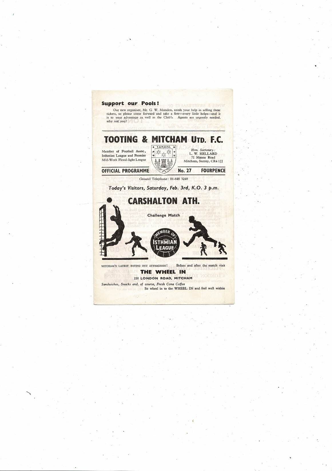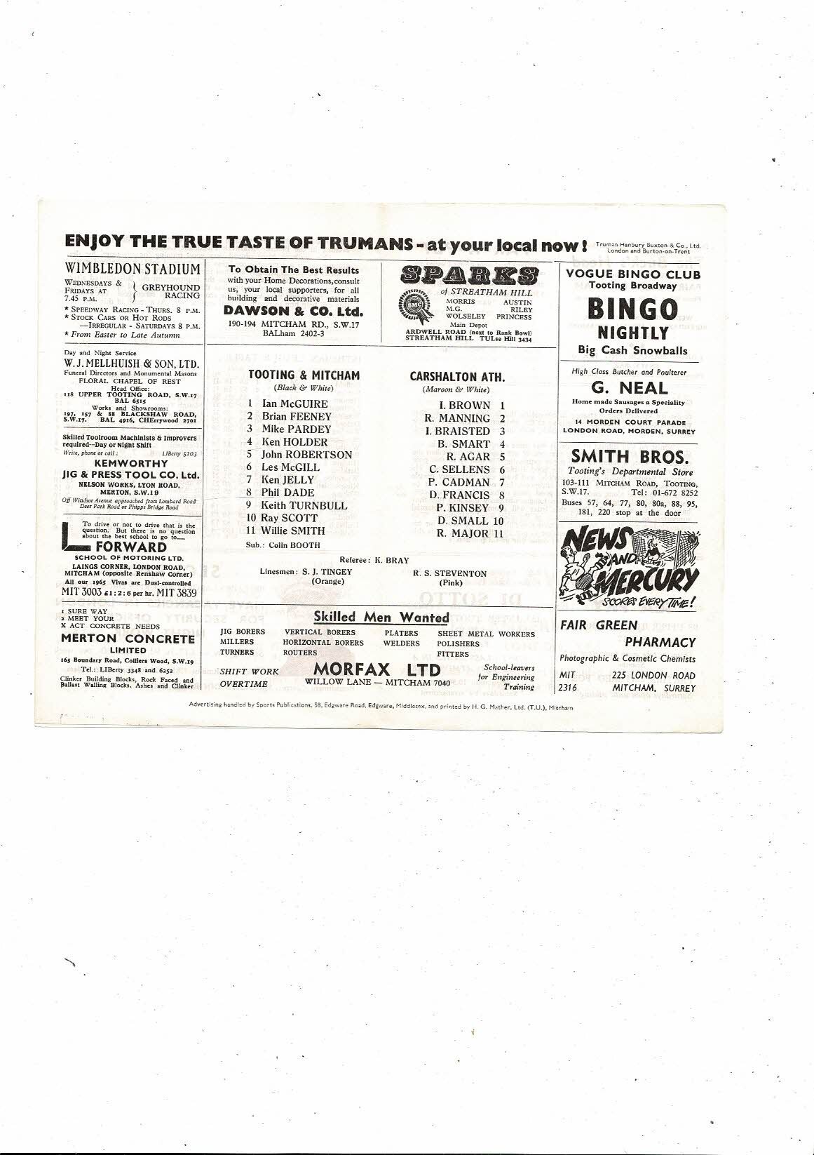 Tooting & Mitcham v Carshalton Athetic Friendly Football Programme 1967/68