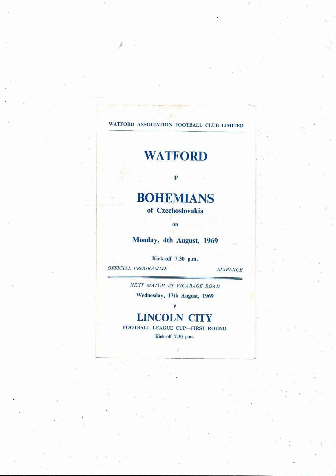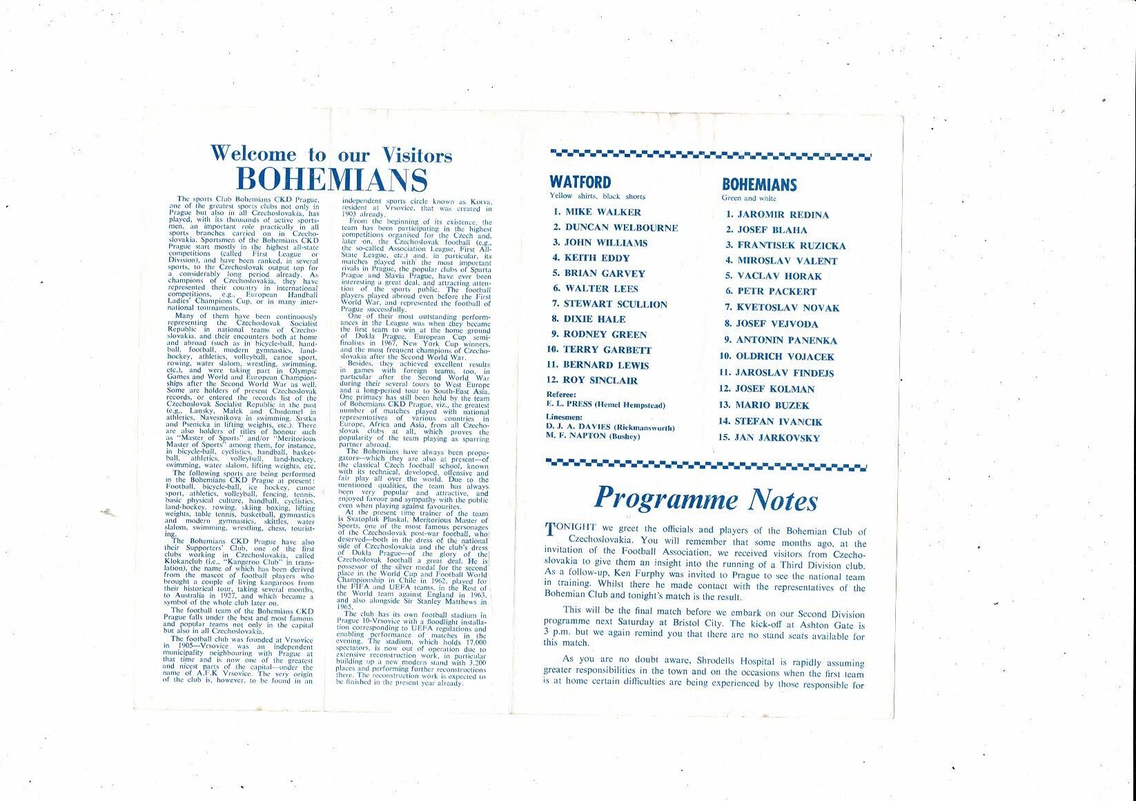 Watford v Bohemians Friendly Football Programme 1969/70
