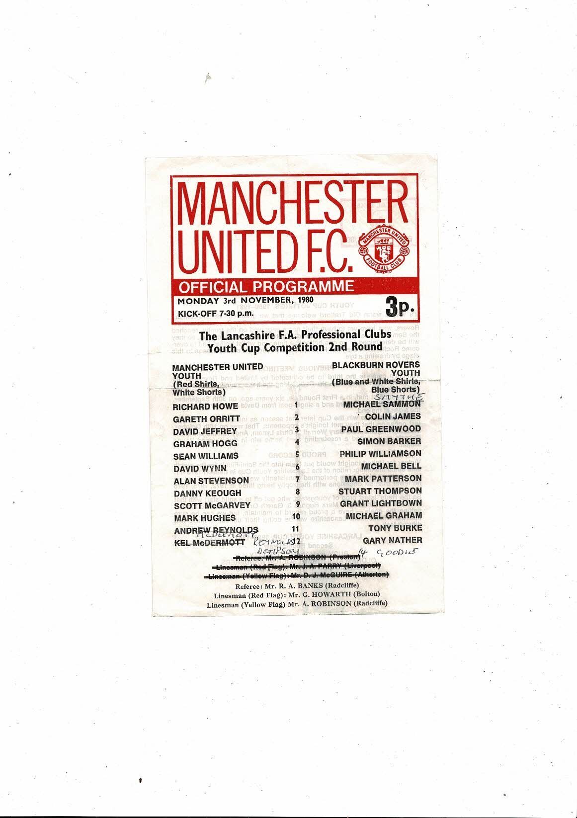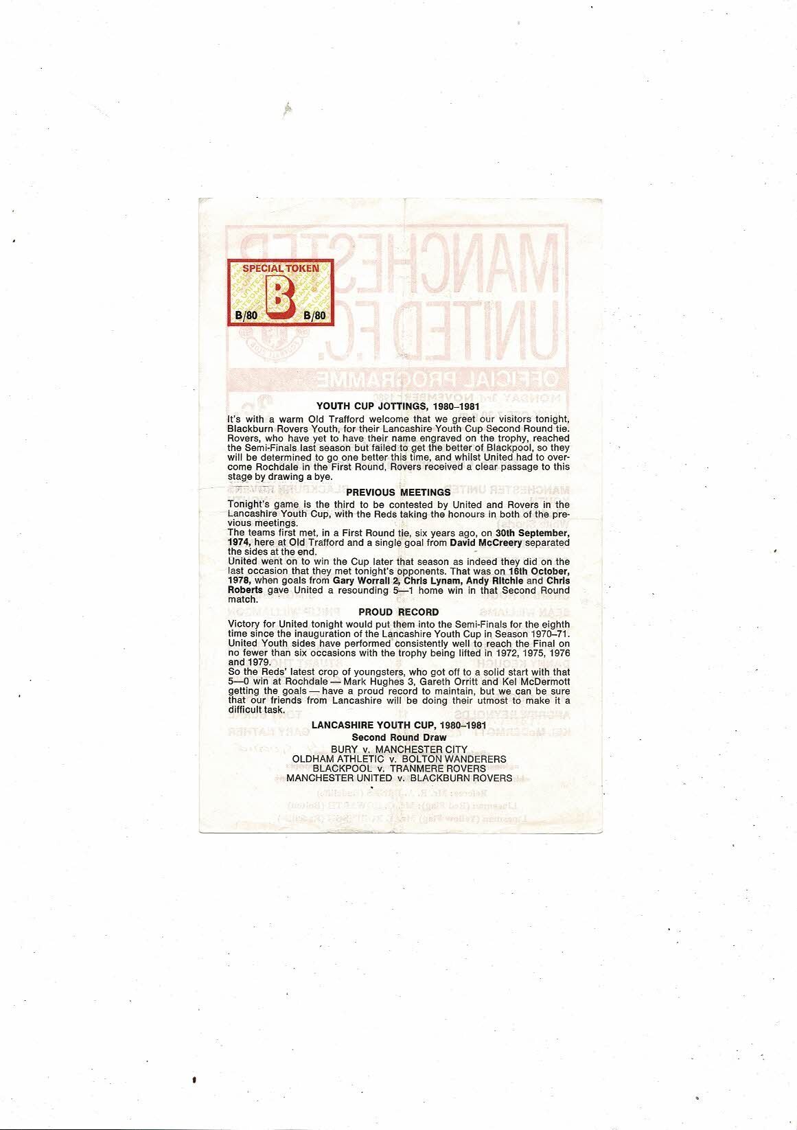 Manchester United v Blackburn Lancashire Youth Cup Football Programme 1980/81