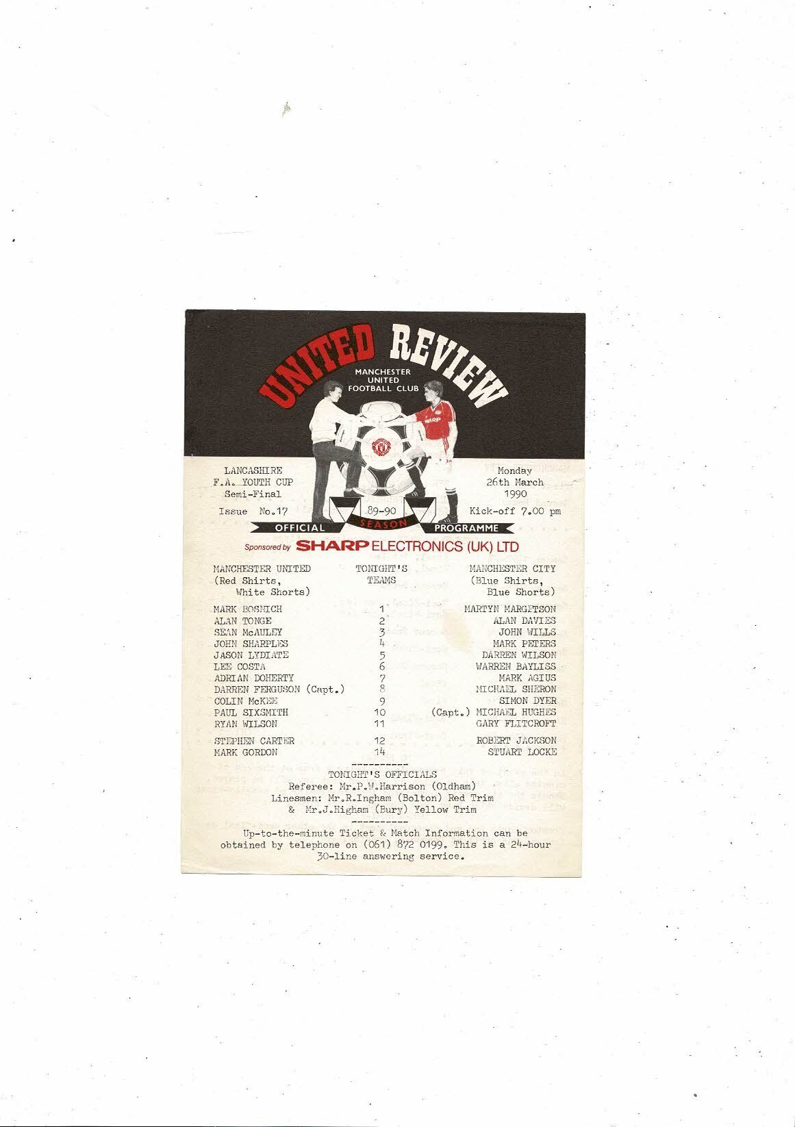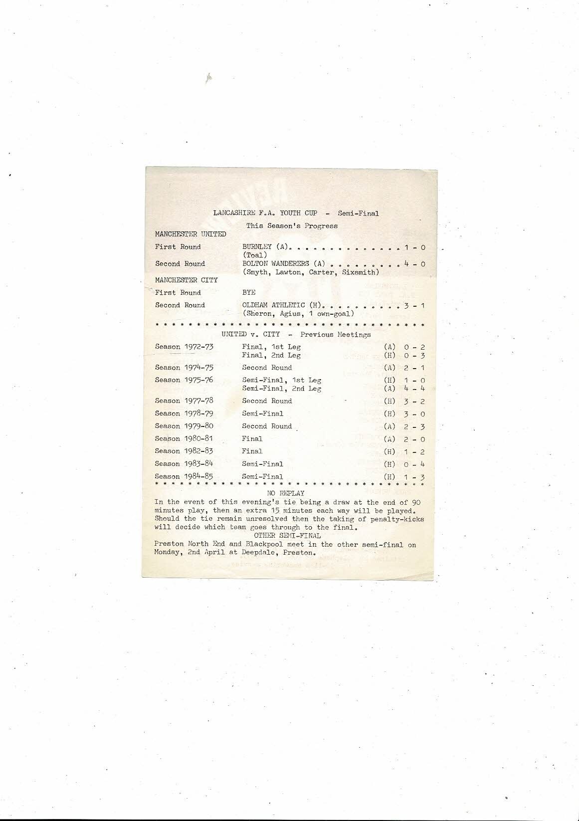Manchester United v Manchester City Lancashire Youth Cup Semi Final 1989/90
