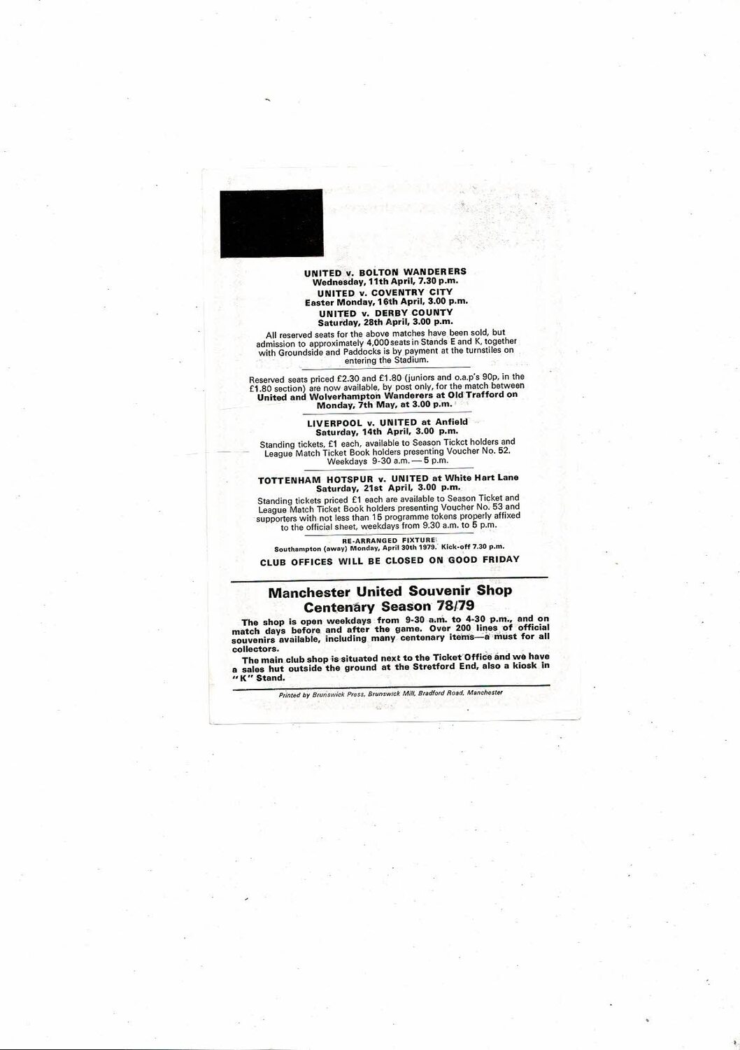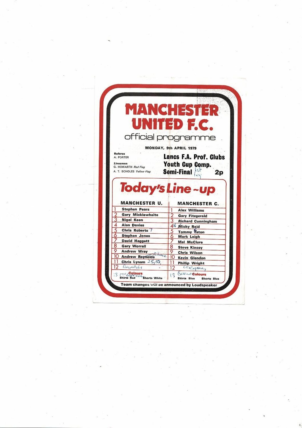 Manchester United v Manchester City Lancs Youth Cup Semi Final Programme 1978/79