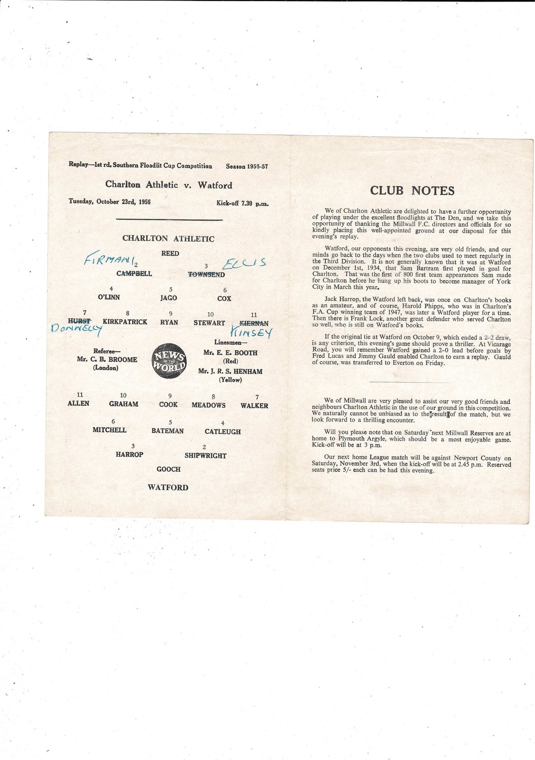 1956/57 Charlton v Watford Floodlit Cup Replay Football Programme @ Millwall