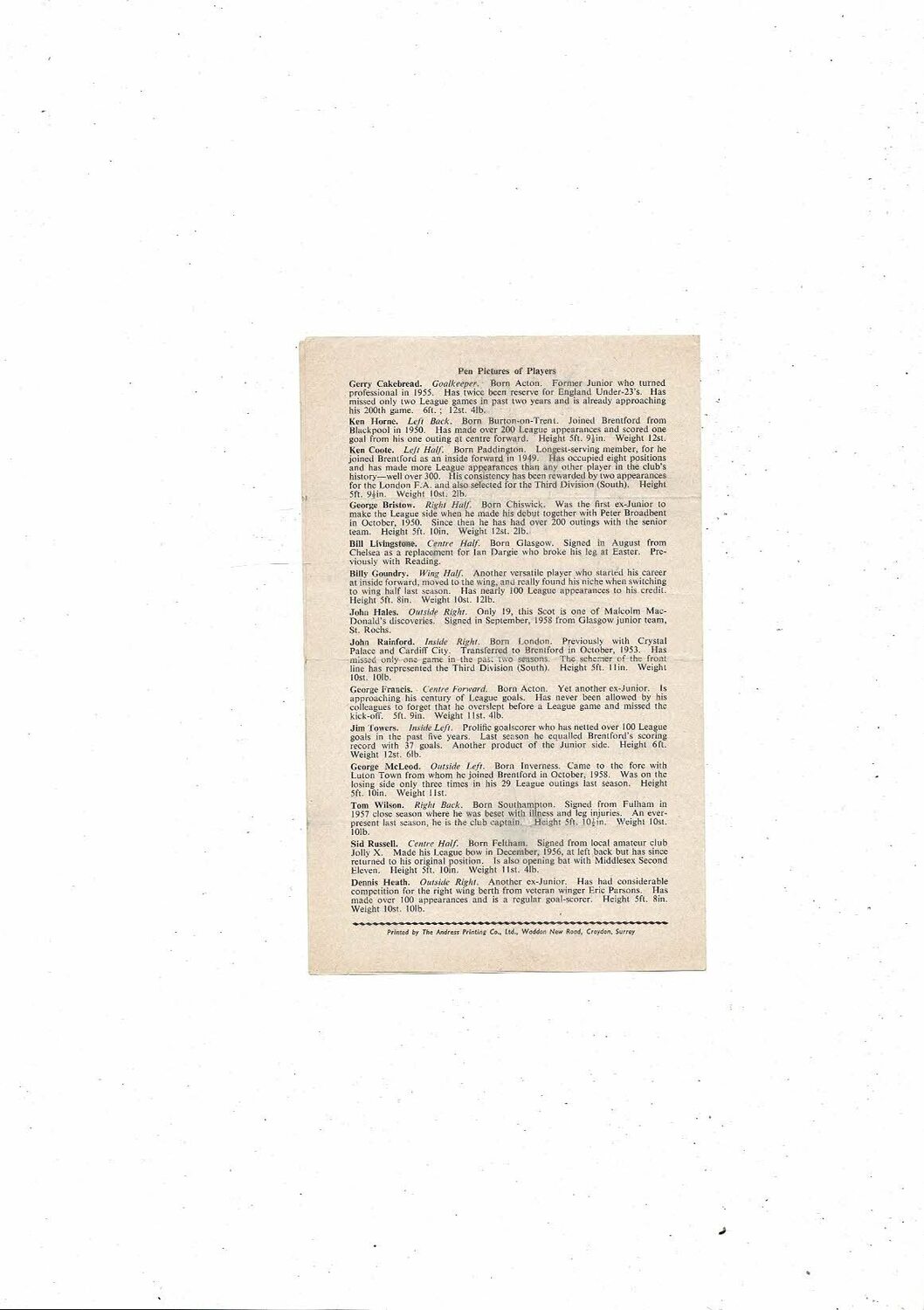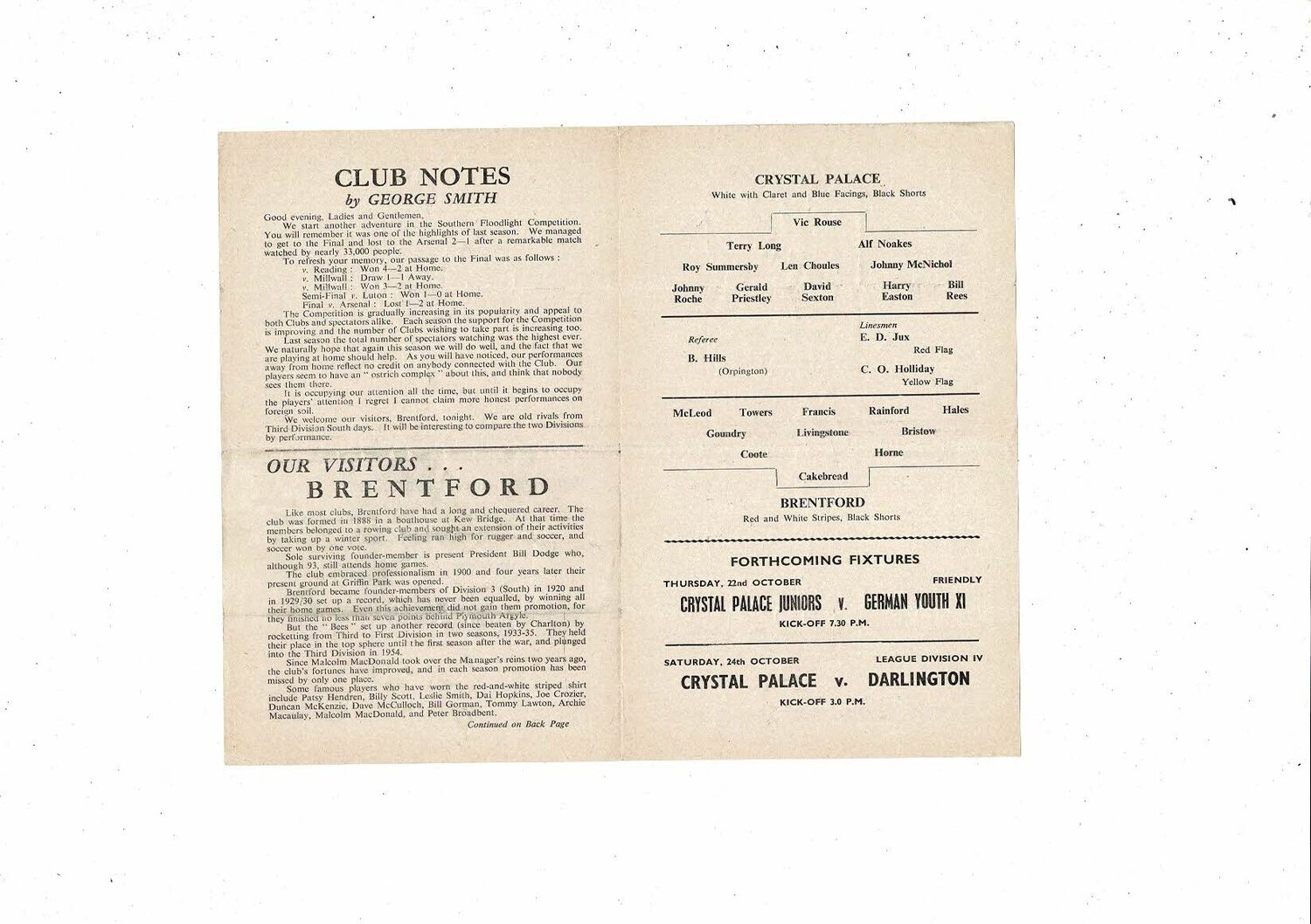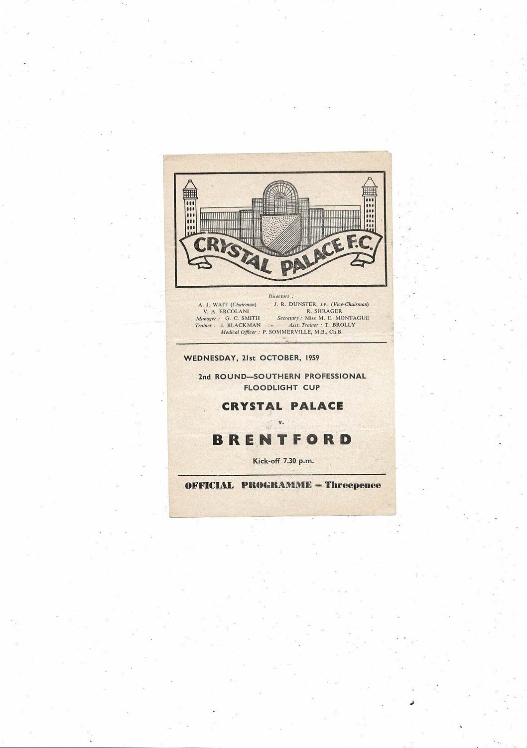 1959/60 Crystal Palace v Brentford Southern Professional Floodlight Cup Football Programme