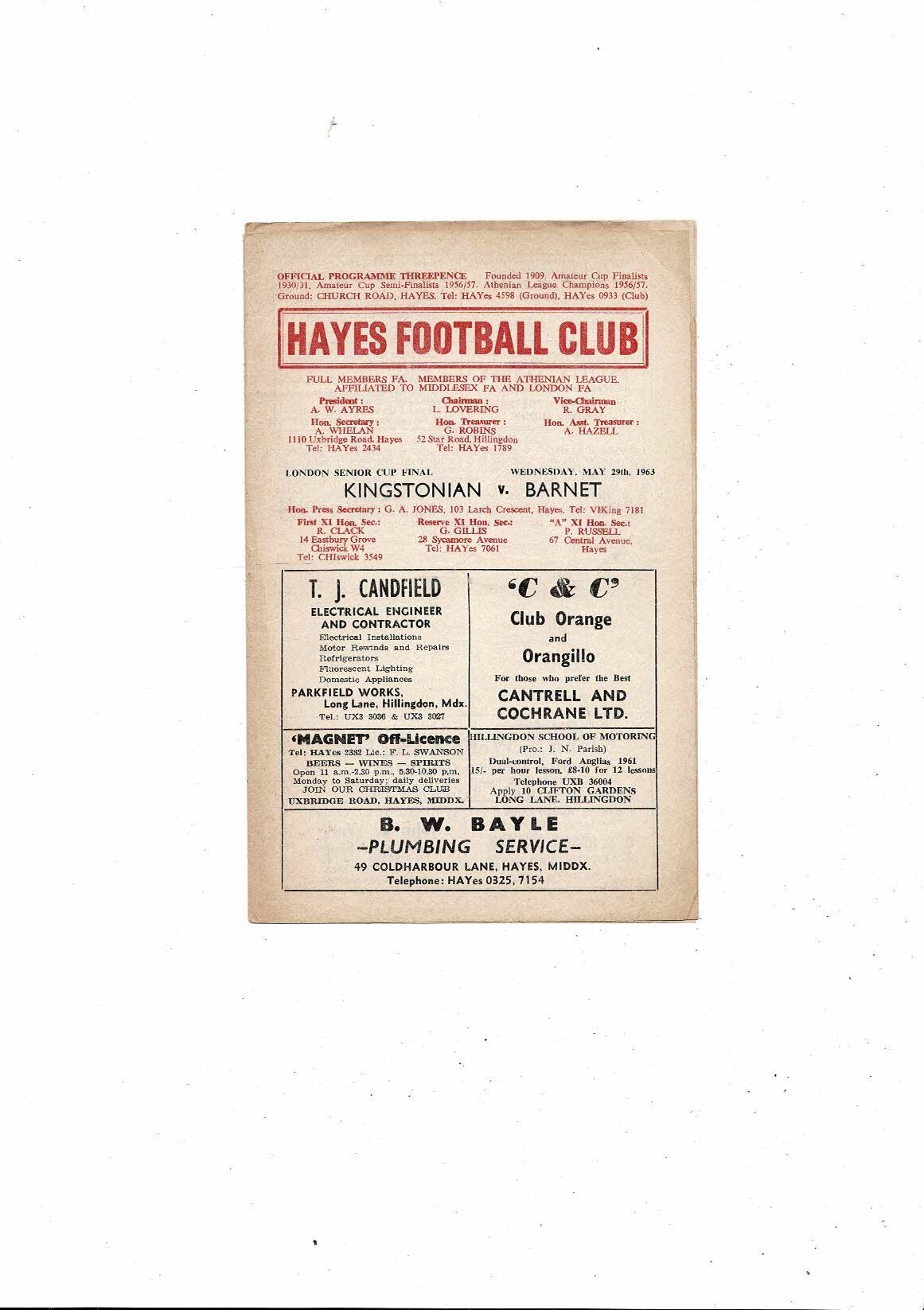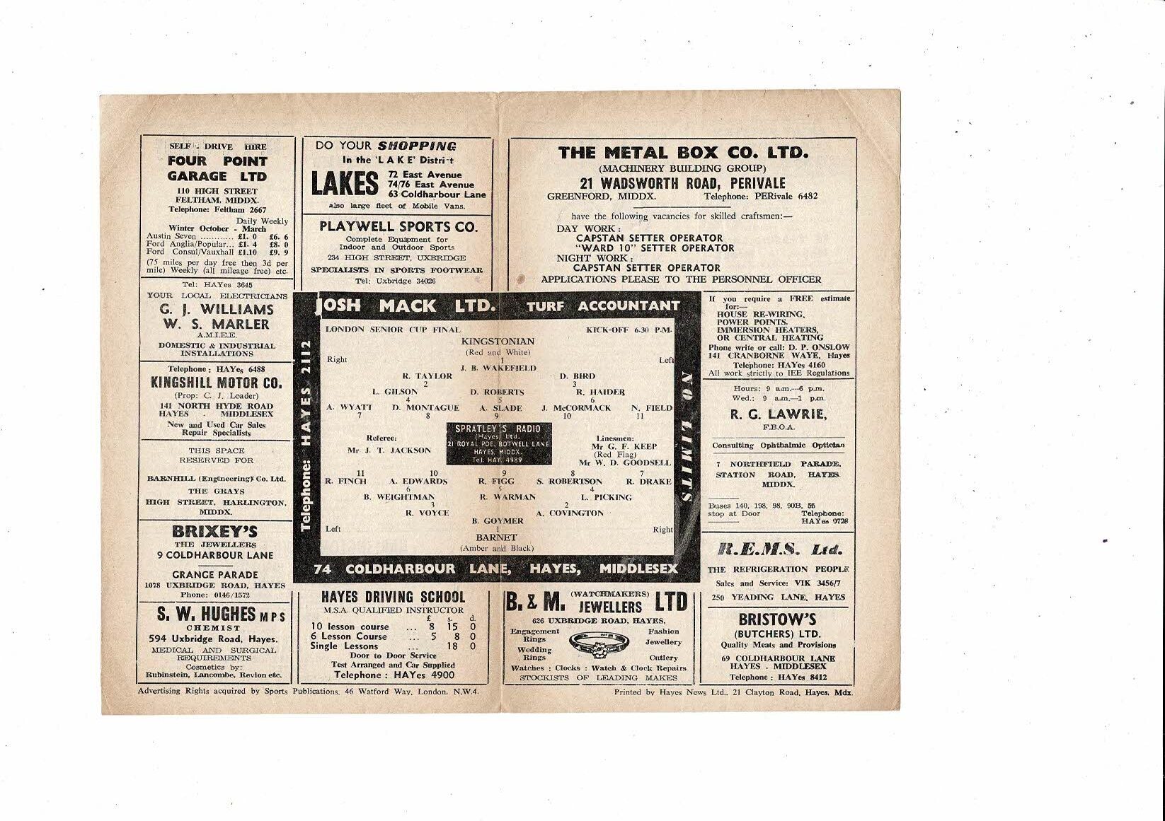 1962/63 Kingstonian v Barnet London Snr Cup Final Football Programme @ Hayes