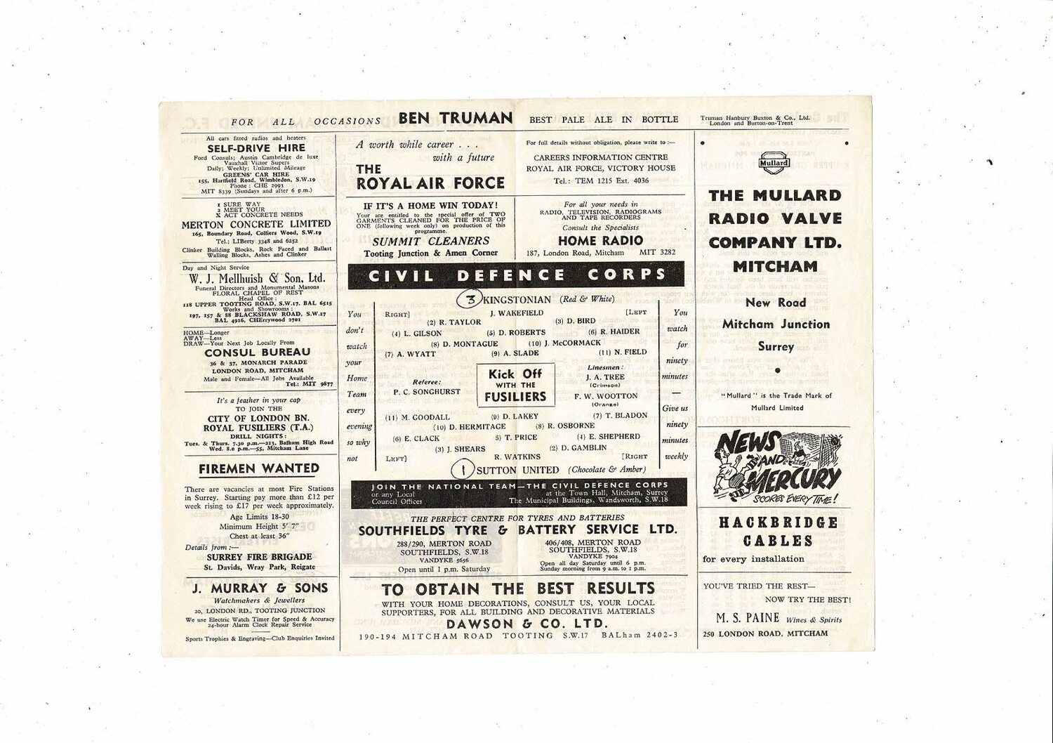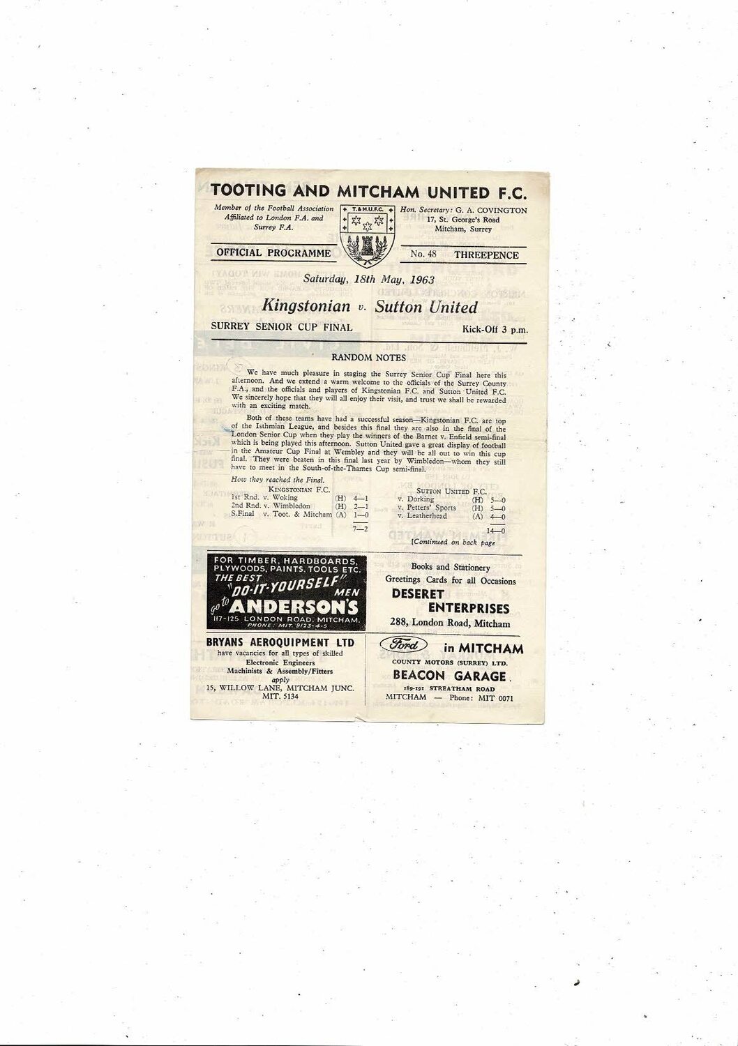 1962/63 Kingstonian v Sutton united Surrey Senior Cup Final Football Programme @ Tooting & Mitcham