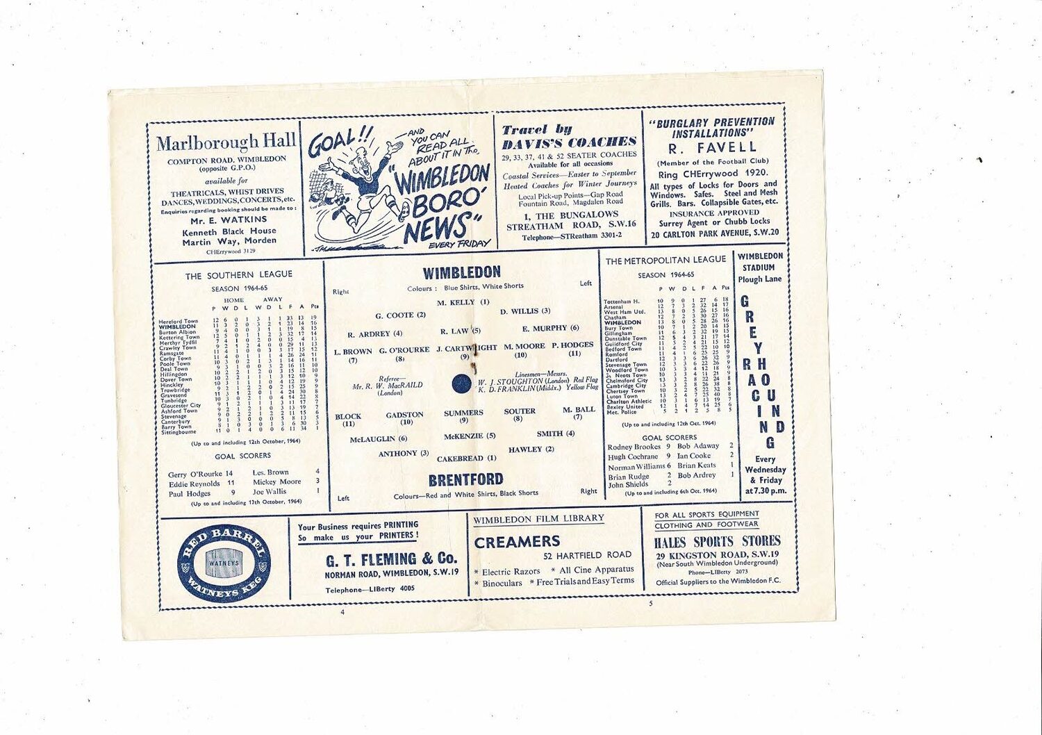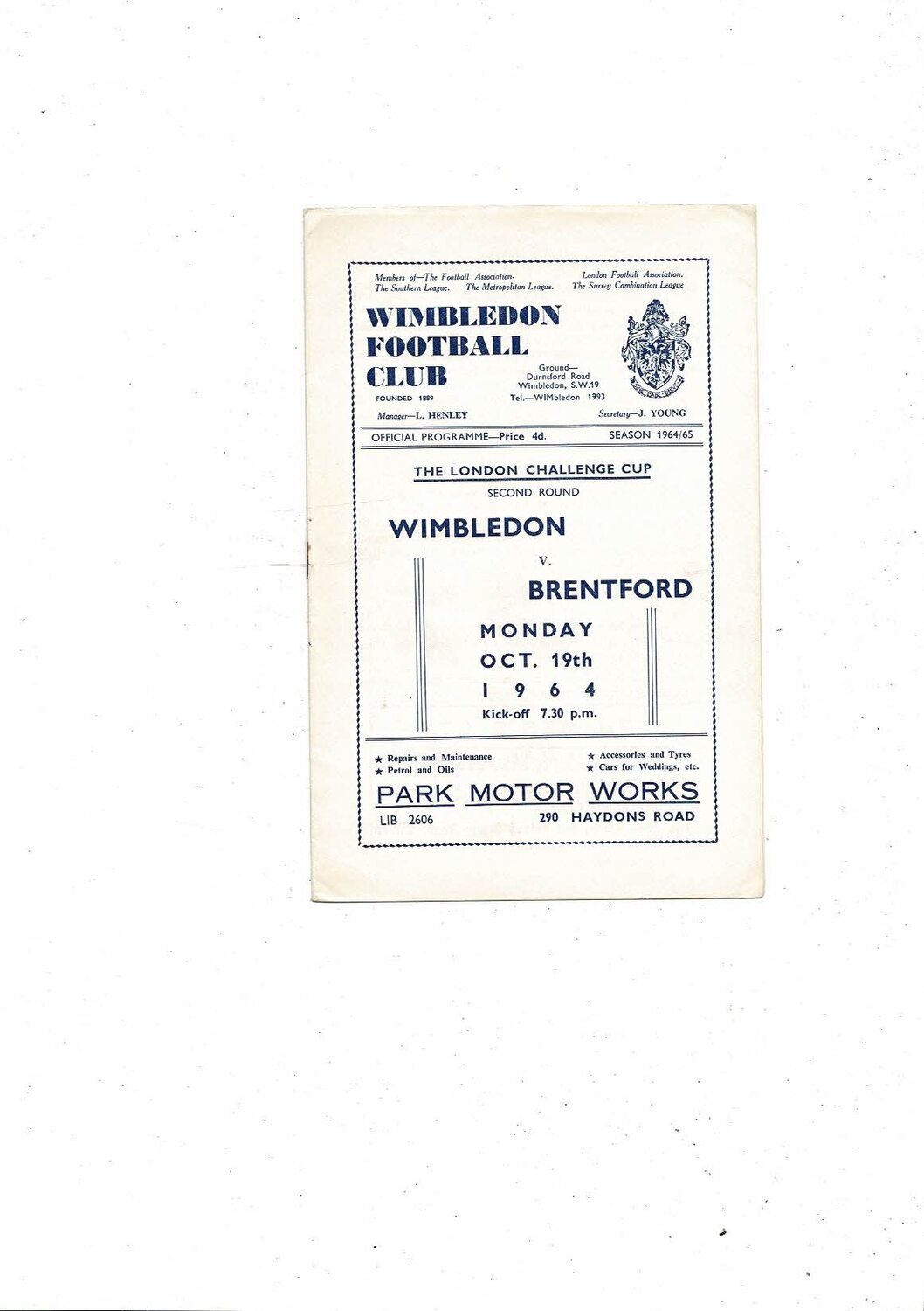 1964/65 Wimbledon v Brentford London Challenge Cup Football Programme
