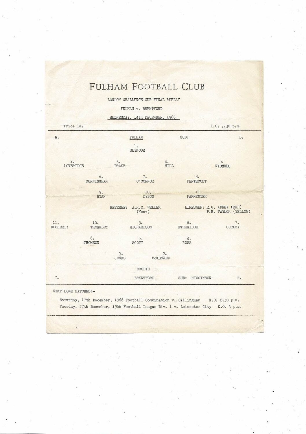 1966/67 Fulham v Brentford London Challenge Cup Final Replay Football Programme