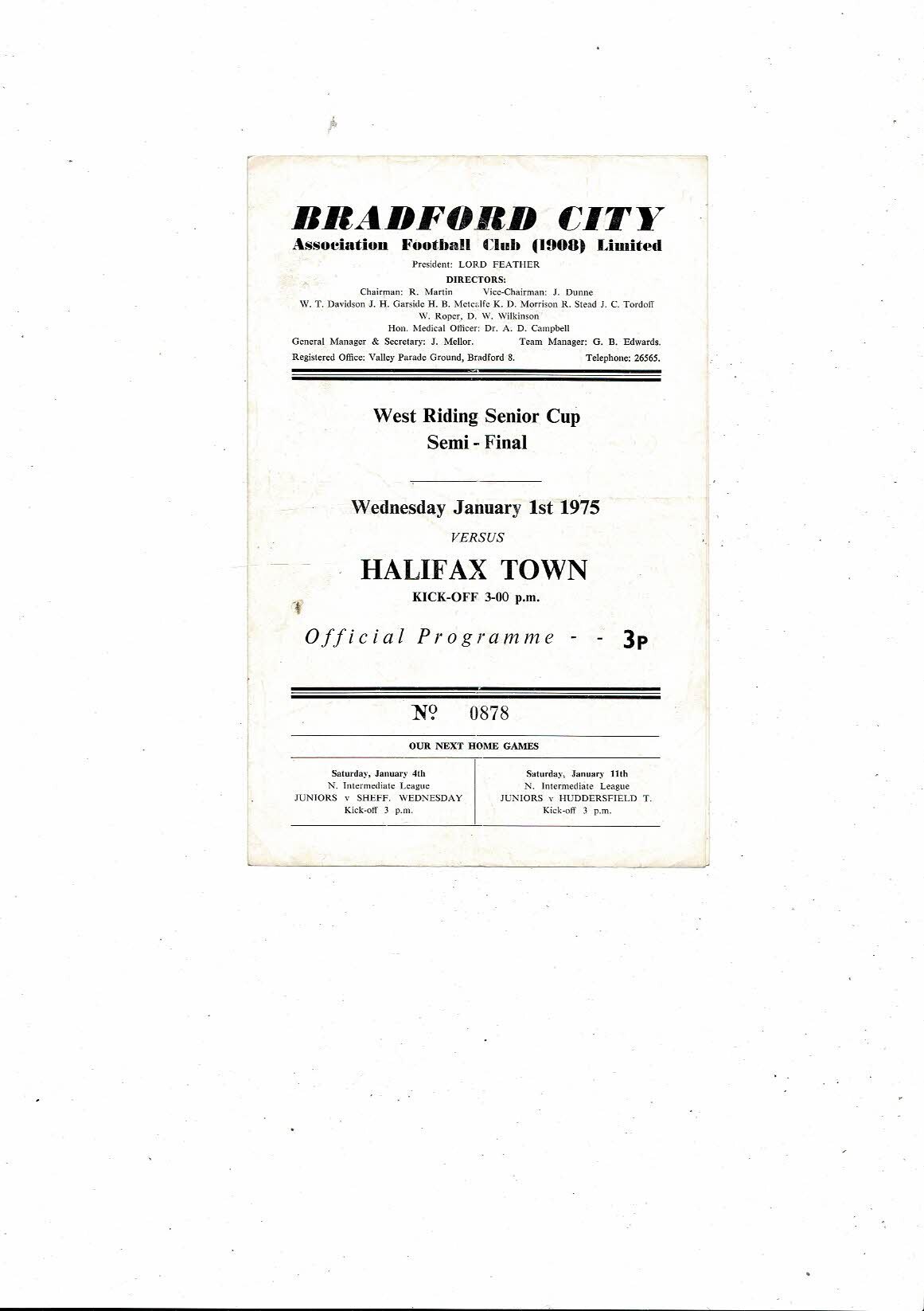 1974/75 Bradford City v Halifax Town West Riding Cup Semi Final Programme