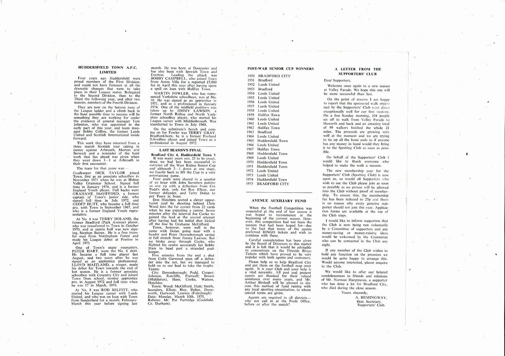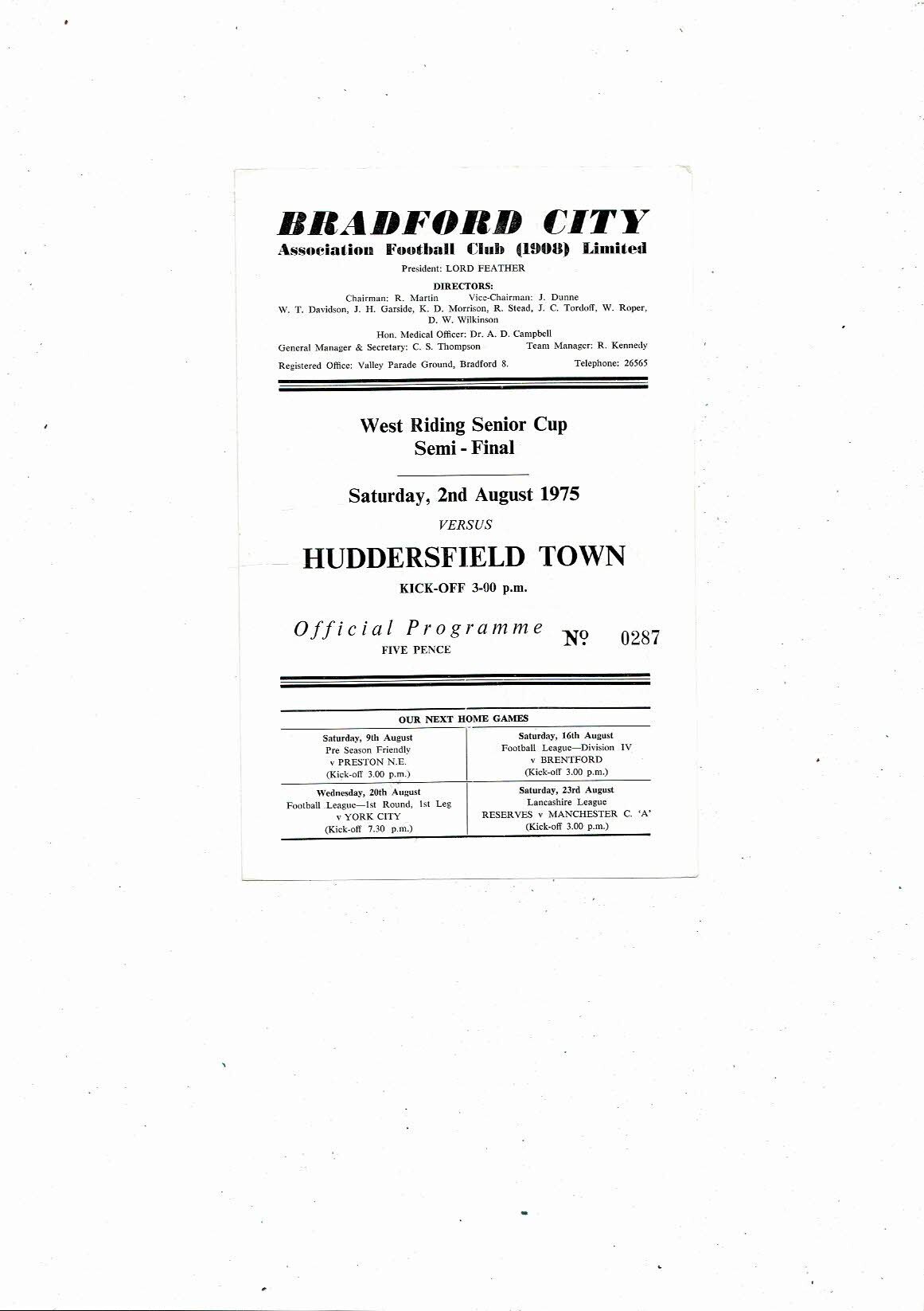 1975/76 Bradford City v Huddersfield Town West Riding Cup Semi Final Programme