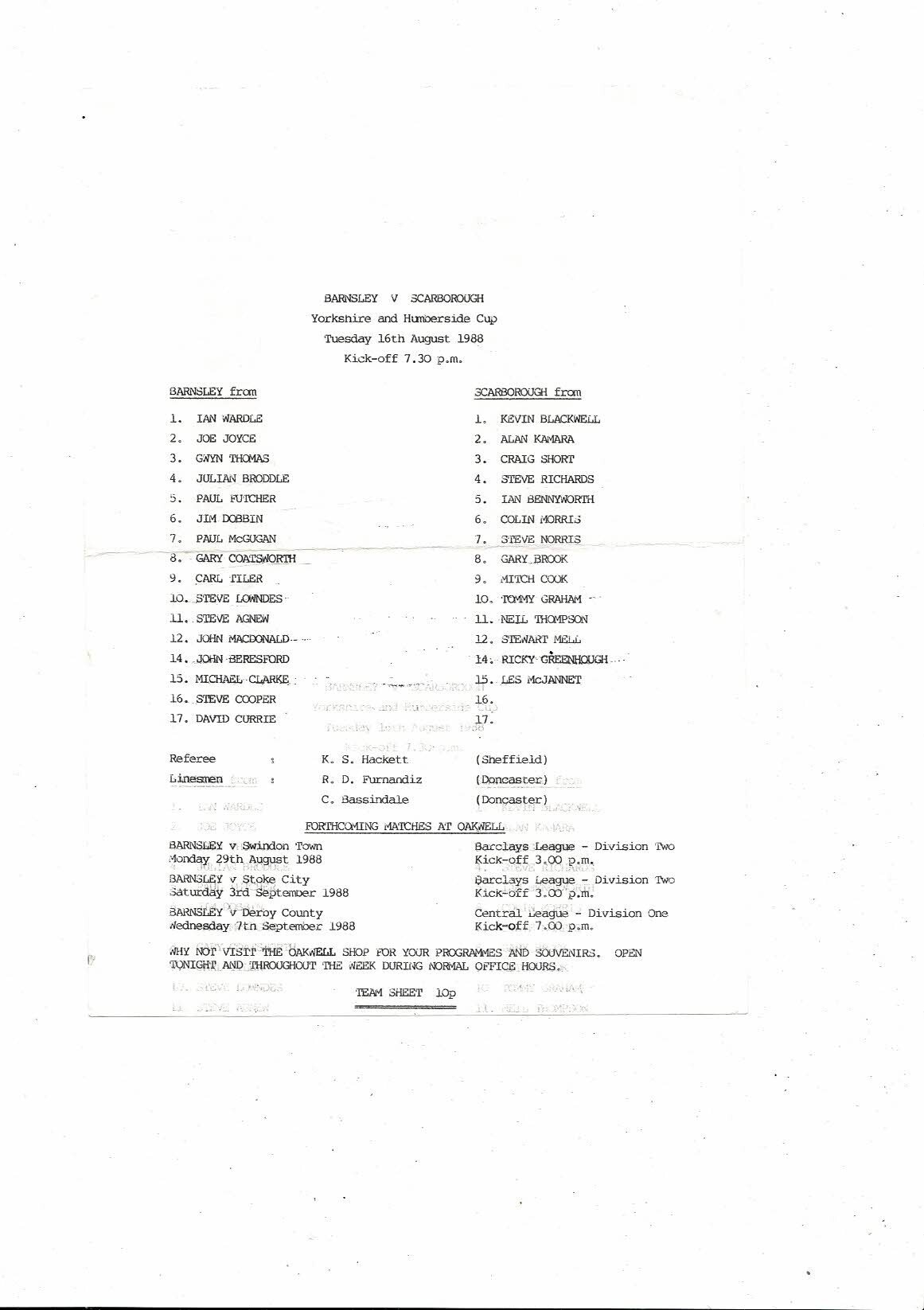 1988/89 Barnsley v Scarborough Yorkshire & Humberside Cup Football Team Sheet