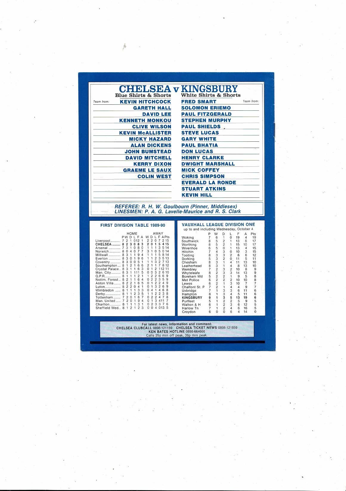 1989/90 Chelsea v Kingsbury Town Middlesex Charity Cup Final Football Programme