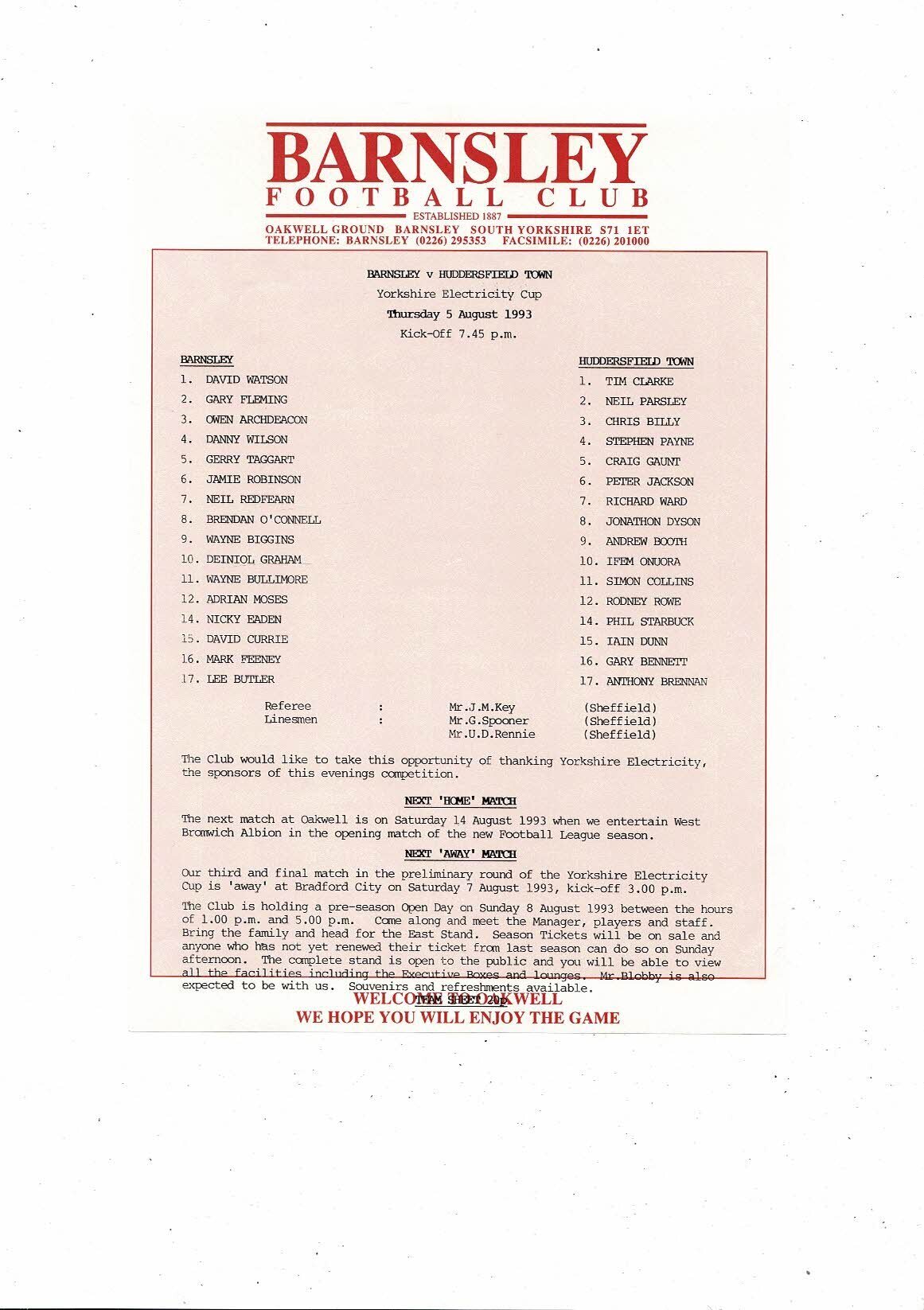 1993/94 Barnsley v Huddersfield Yorkshire Electricity Cup Football Programme