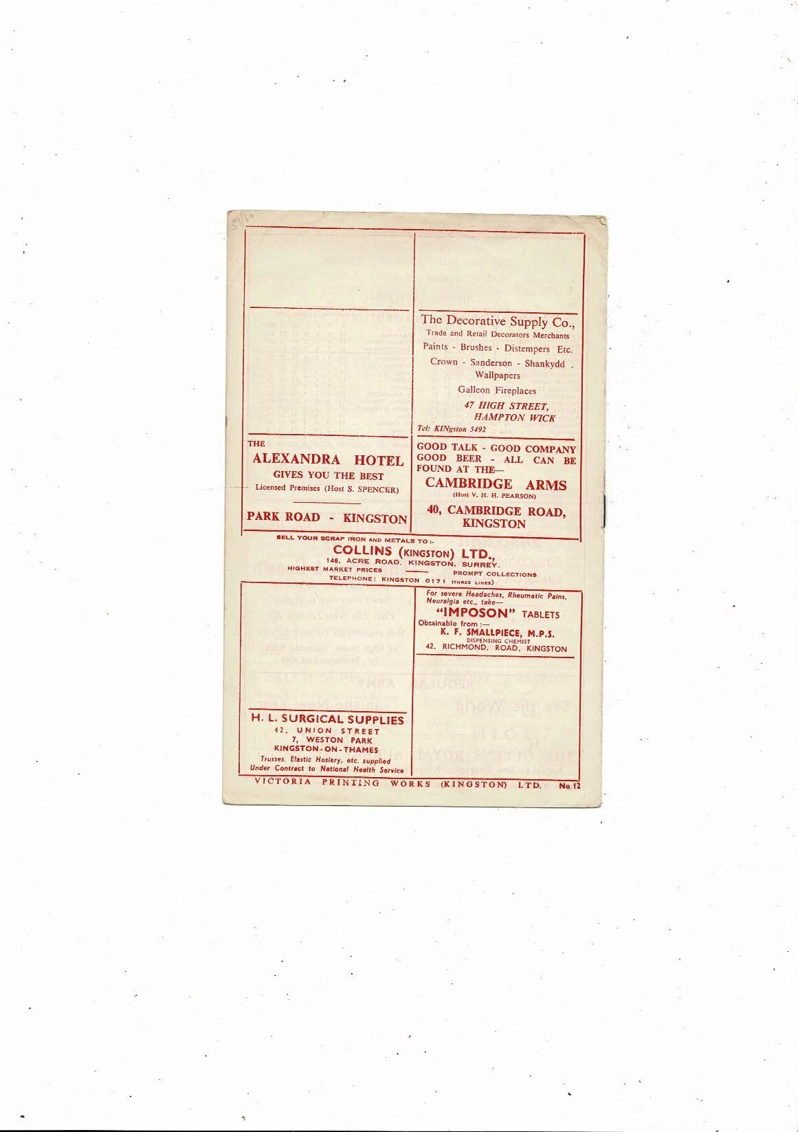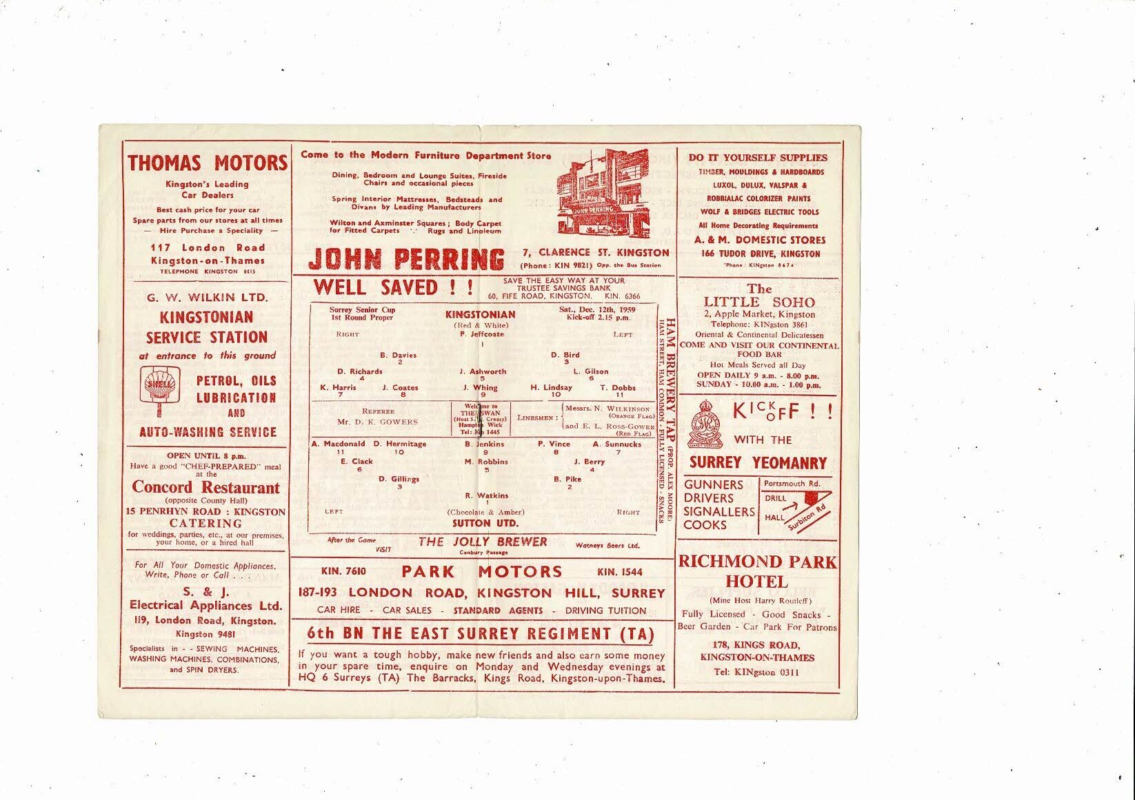 Kingstonian v Sutton United Surrey Senior Cup Football Programme 1959/60