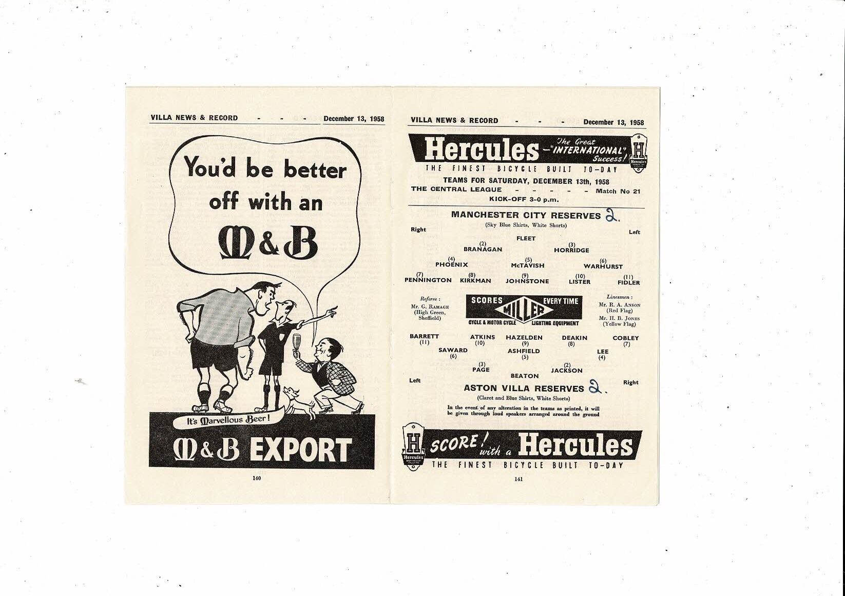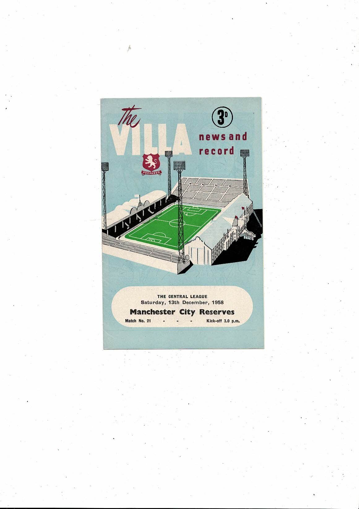 Aston Villa v Manchester City Central League Football Programme 1958/59