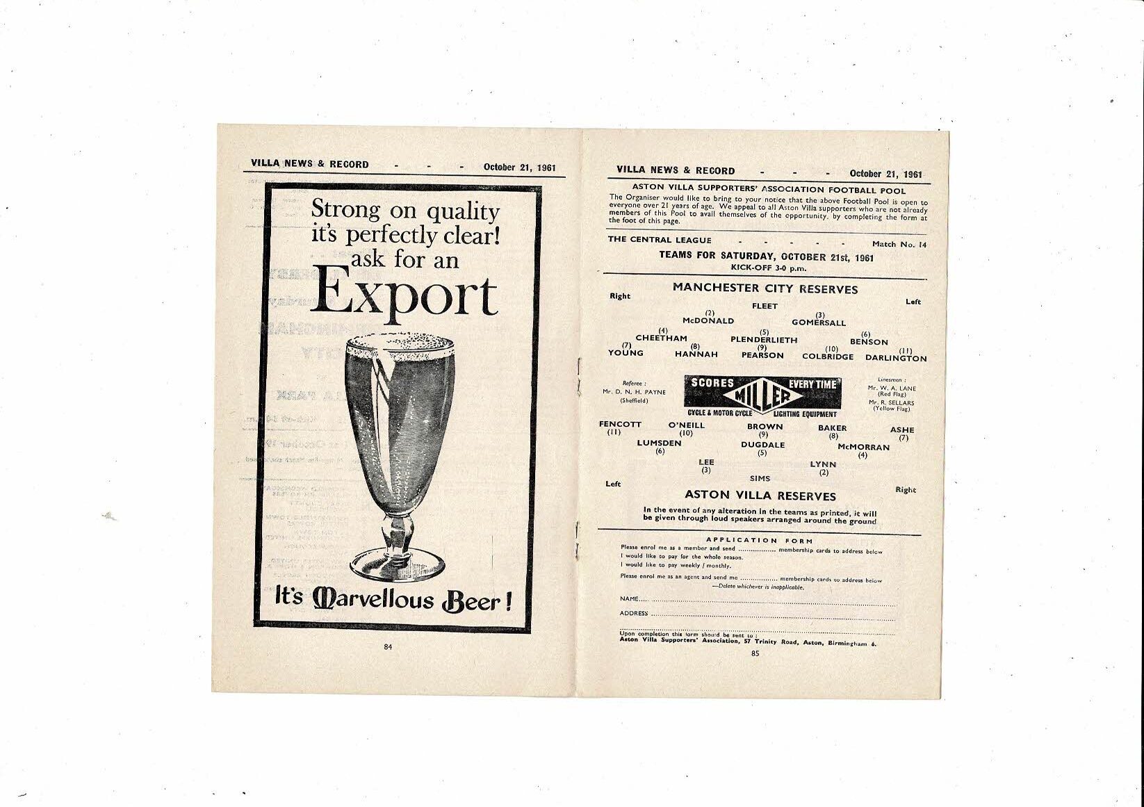Aston Villa v Manchester City Central League Football Programme 1961/62