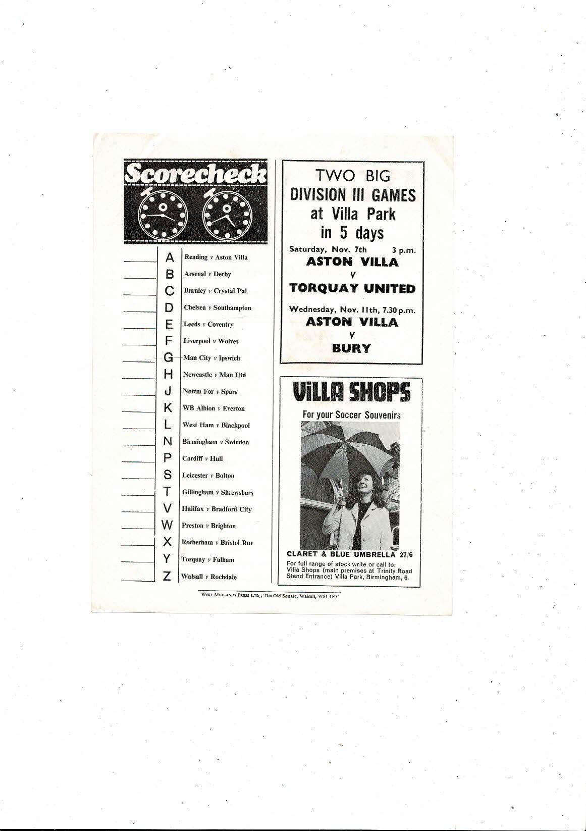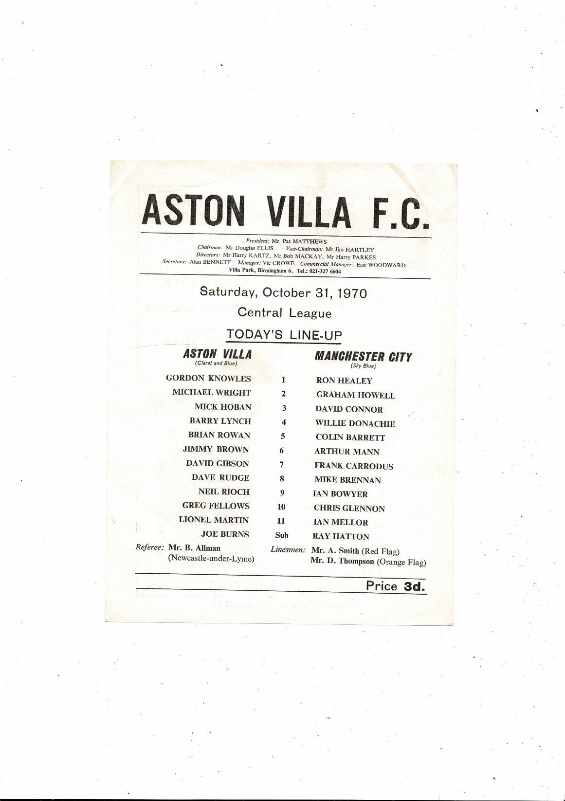 Aston Villa v Manchester City Central League Football Programme 1970/71