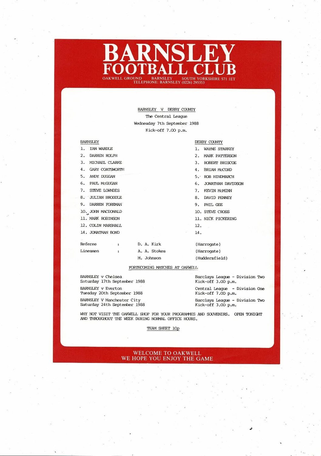 Barnsley v Derby County Central League Football Programme 1988/89