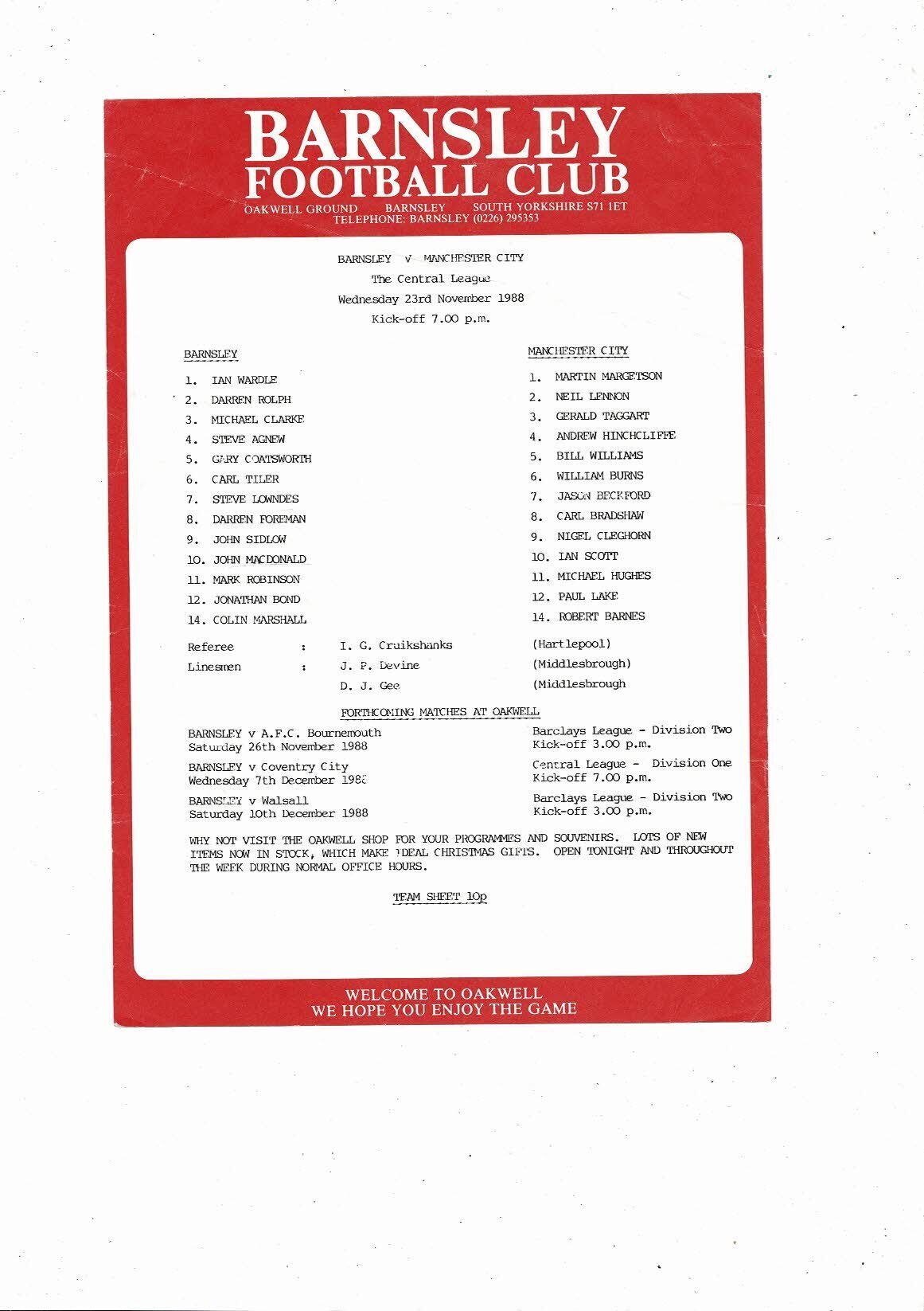 Barnsley v Manchester City Central League Football Programme 1988/89