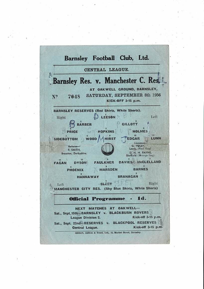 Barnsley v Manchester City Central League Reserves Football Programme 1956/57