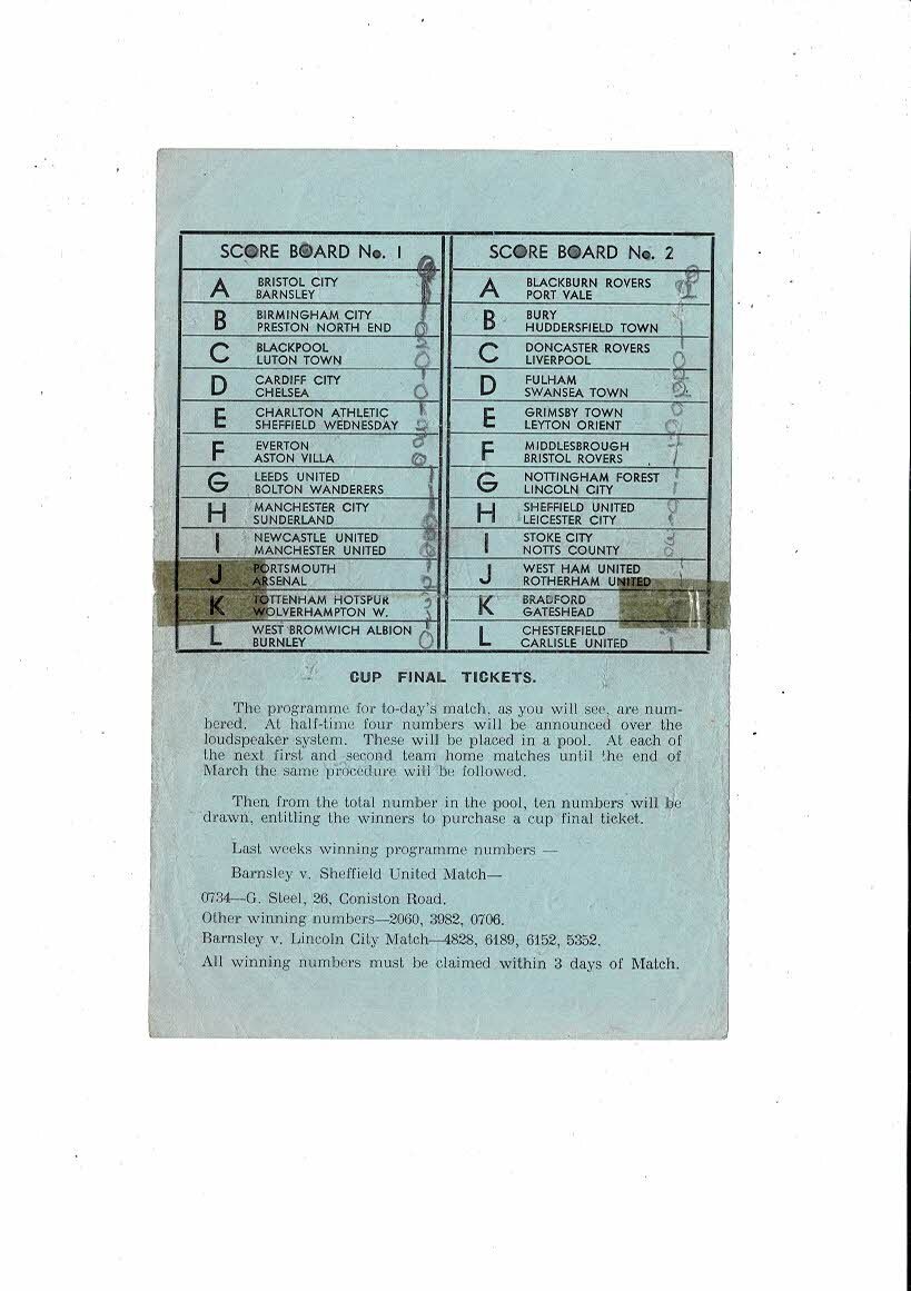 This original single sheet Football Programme is creased also has a fold with some tape, several small tears, score & half times noted with other writing on team page. Please see scans