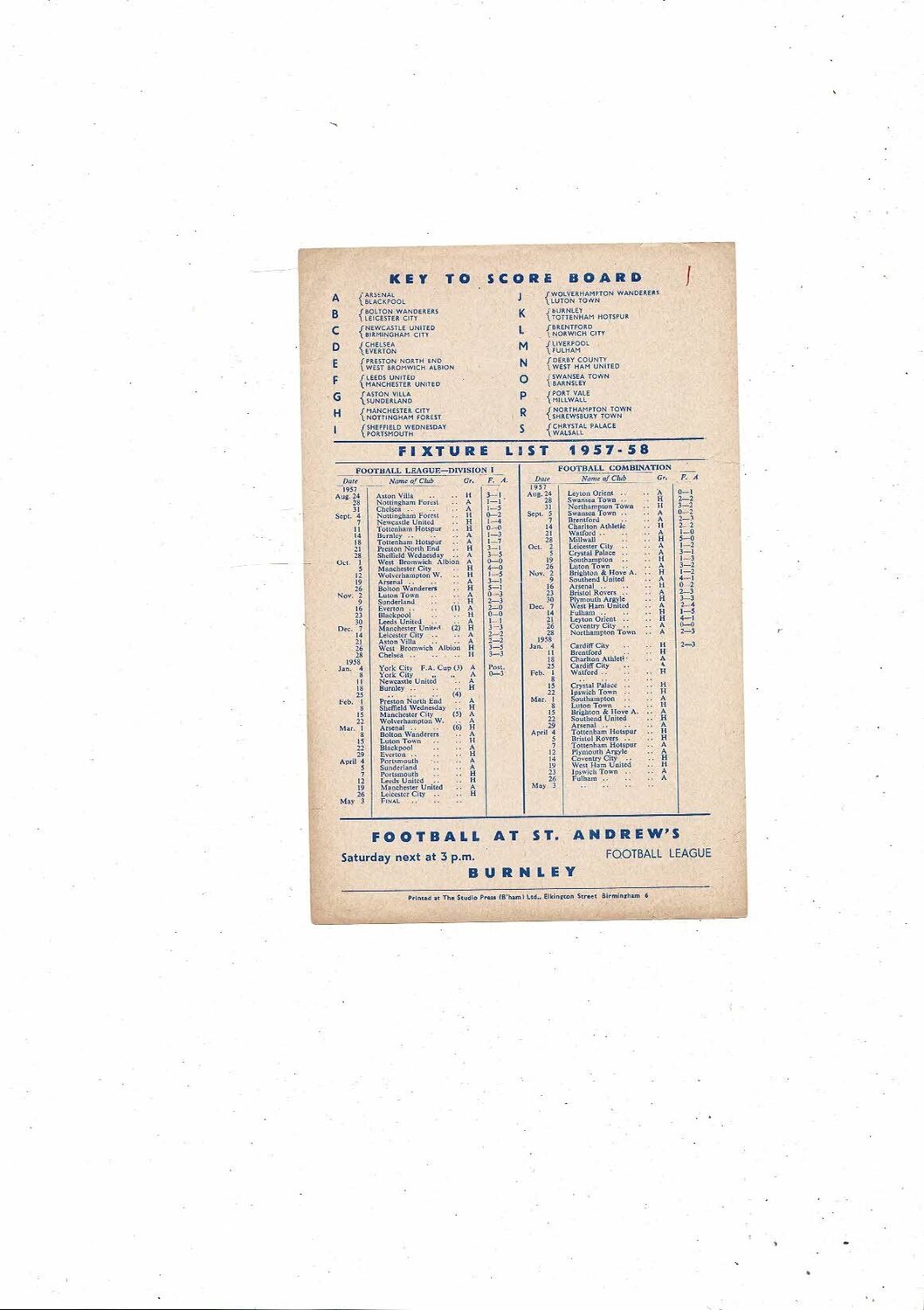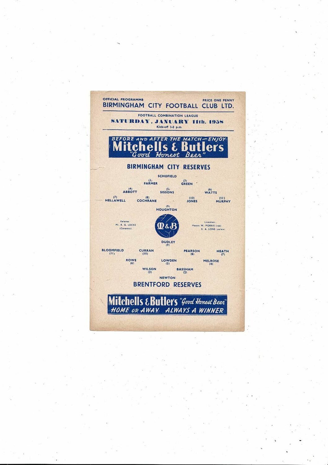 Birmingham City v Brentford Football Combination Programme 1957/58