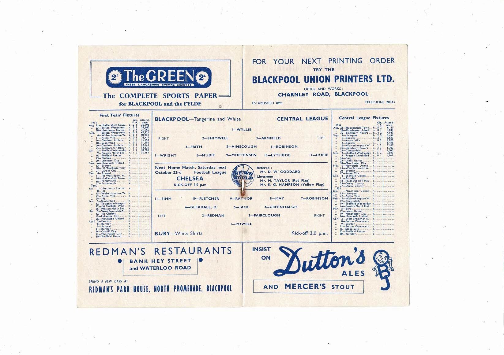 Blackpool v Bury Central League Football Programme 1954/55