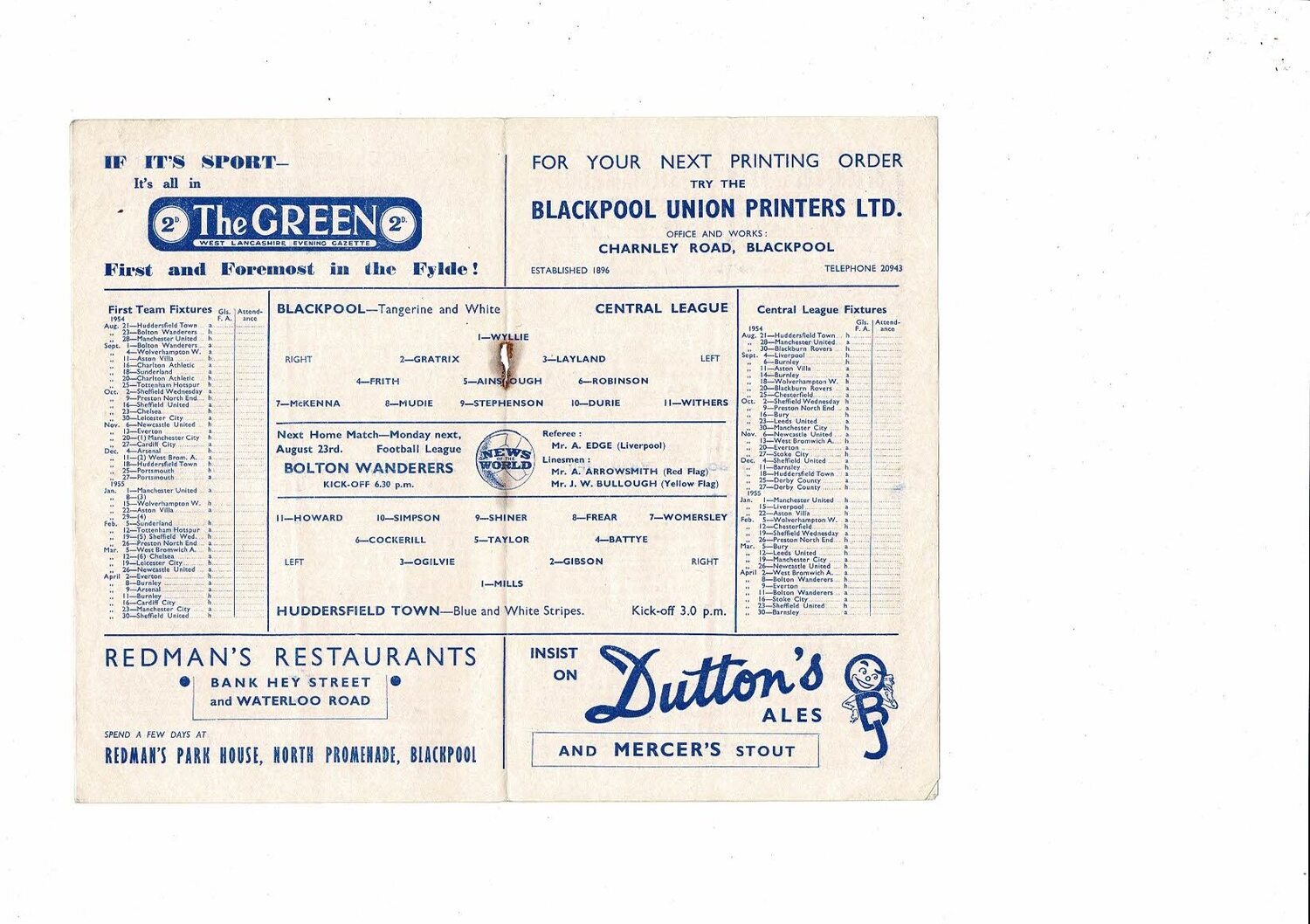Blackpool v Huddersfield Central League Football Programme 1954/55
