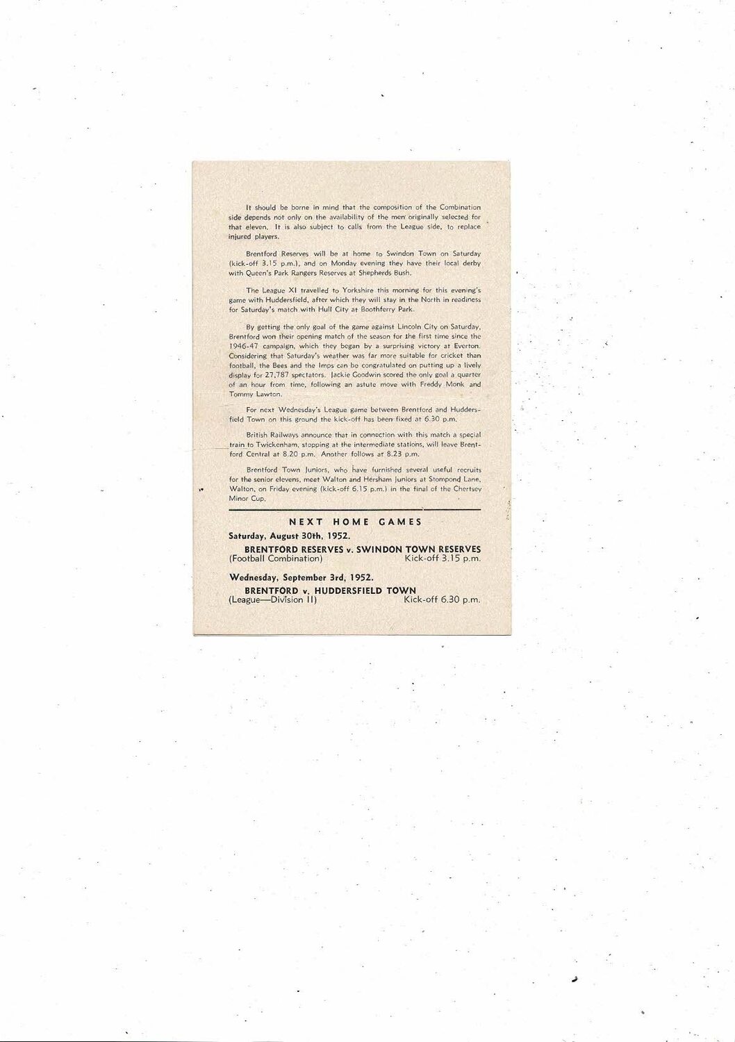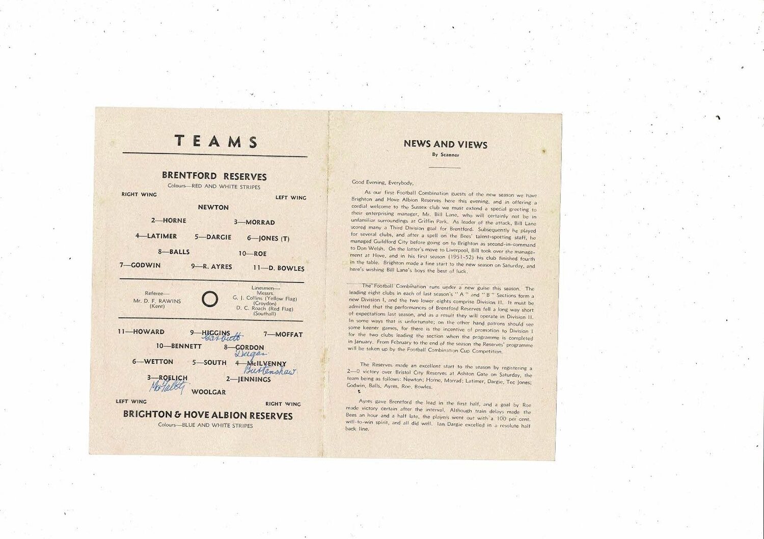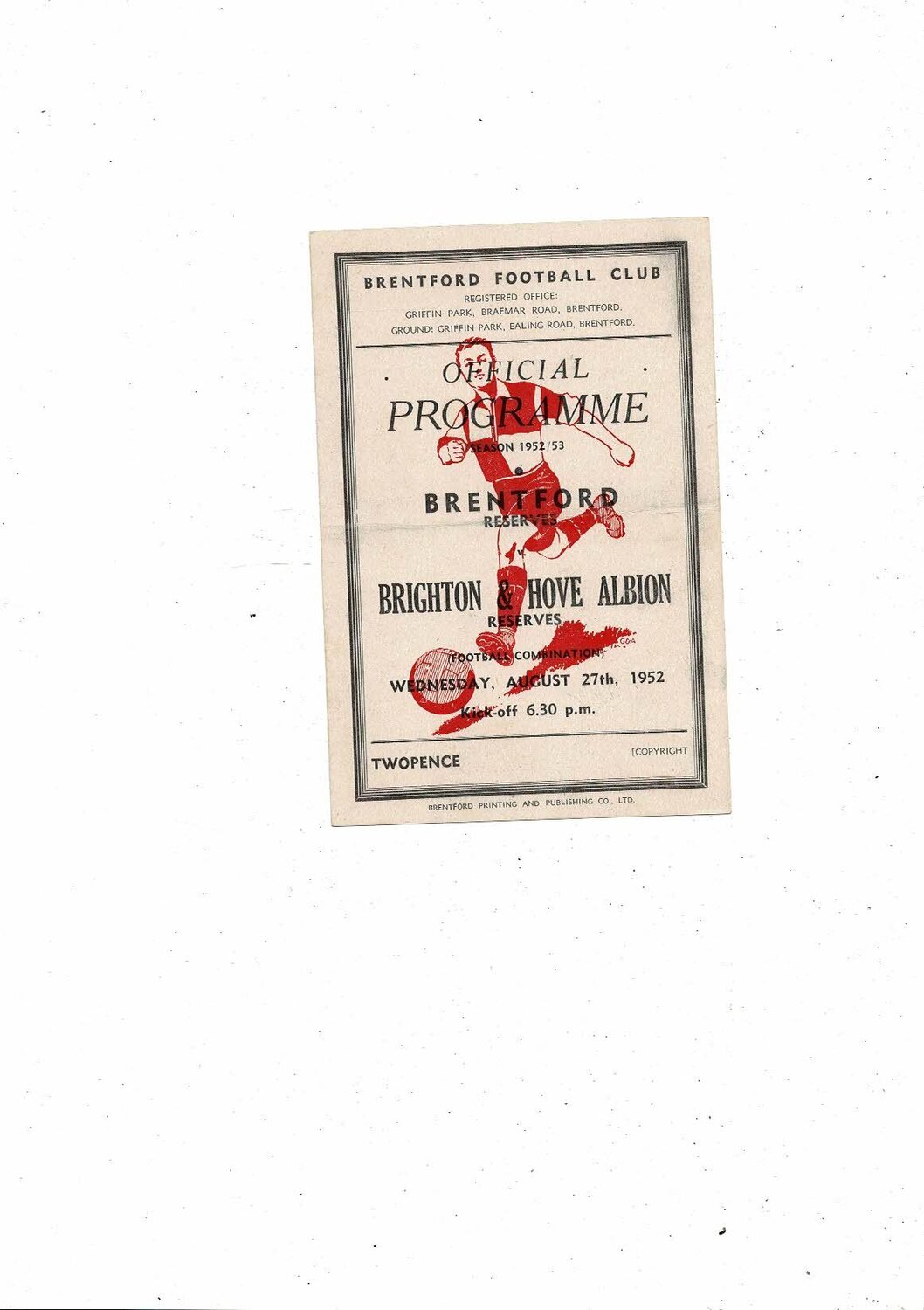 Brentford v Brighton Football Combination Cup Football Programme 1952/53