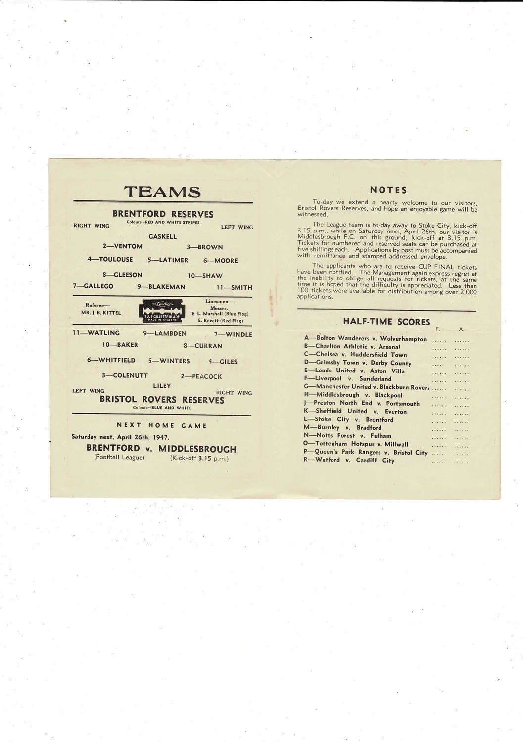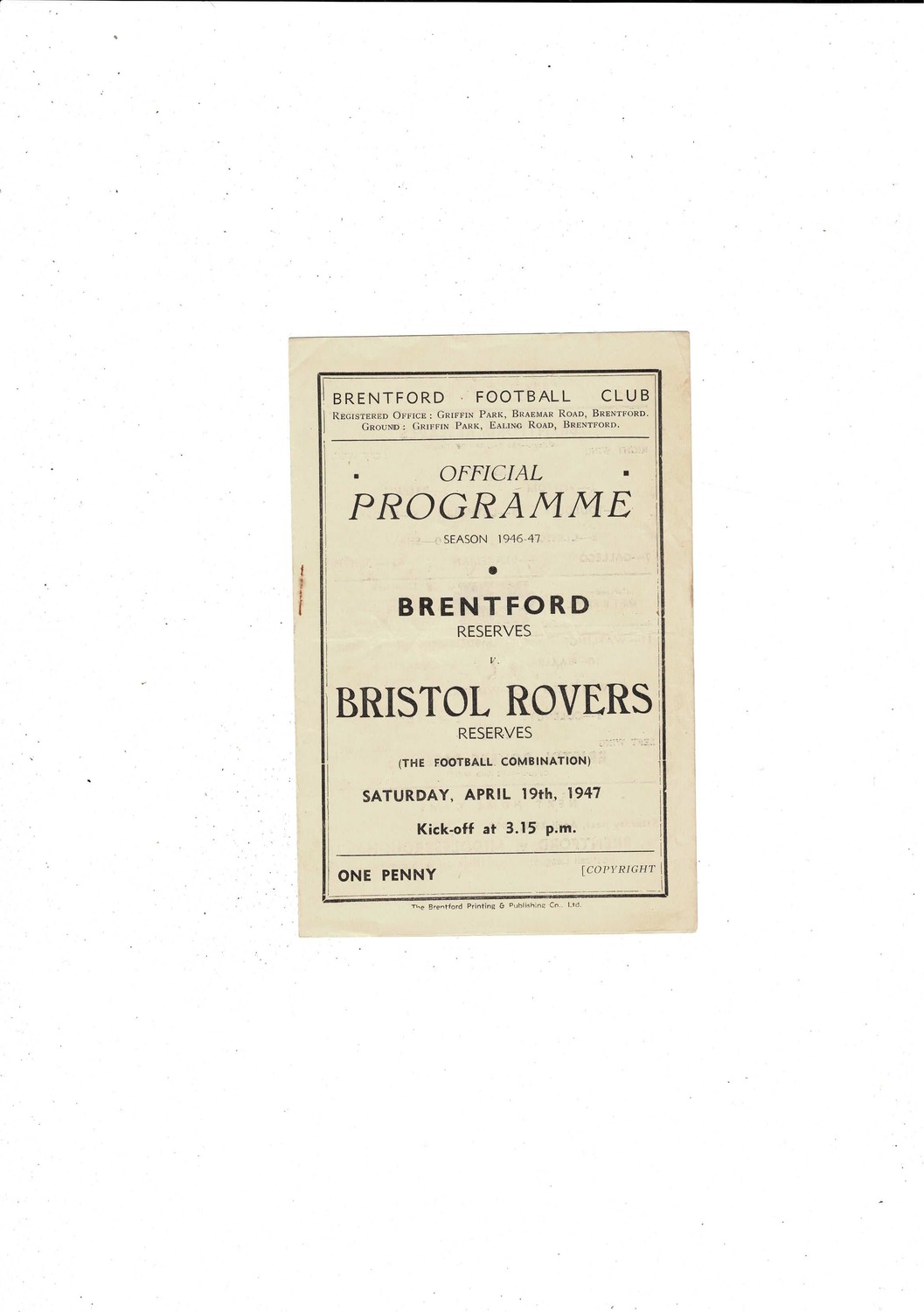Brentford v Bristol Rovers Football Combination Programme 1946/47