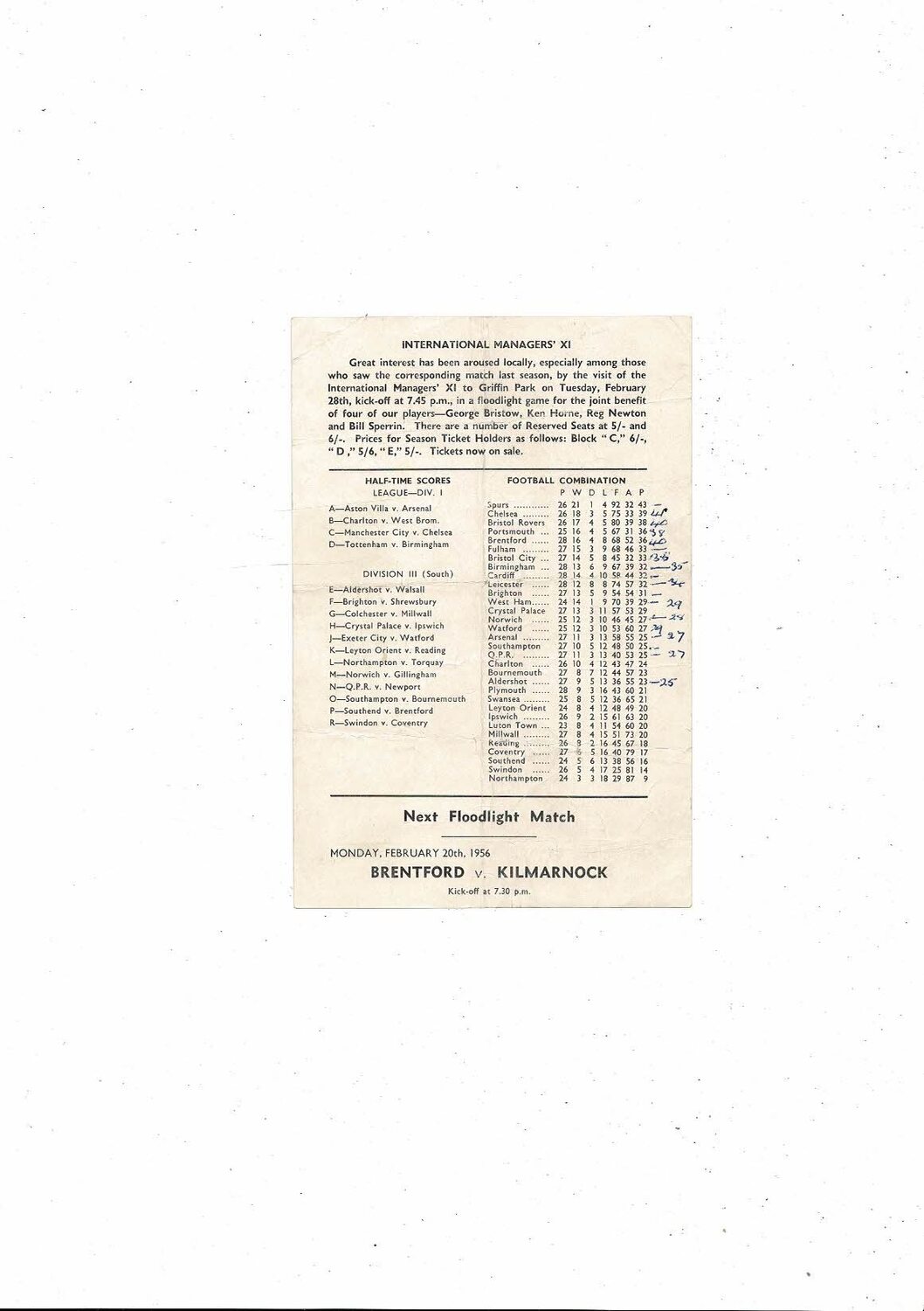 Brentford v Bristol Rovers Football Combination Programme 1955/56