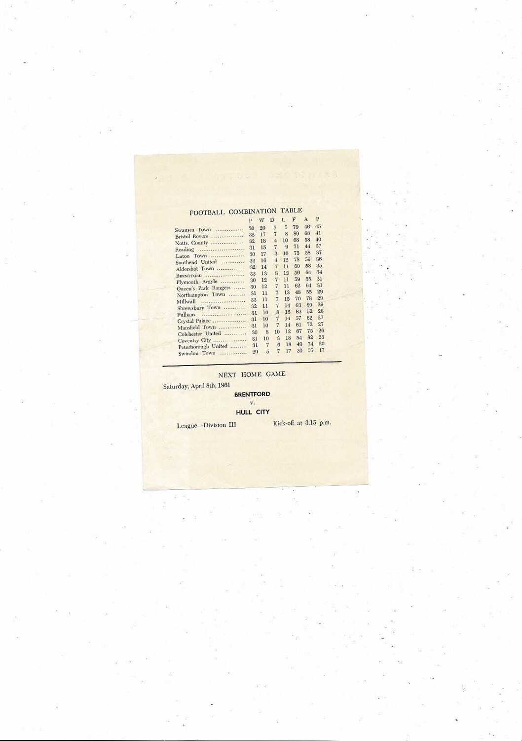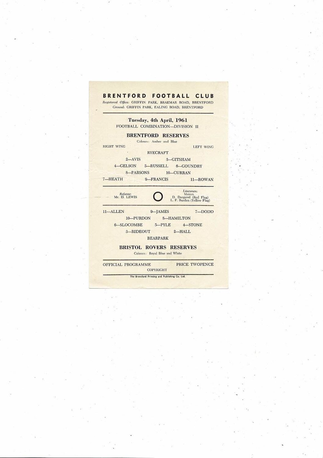 Brentford v Bristol Rovers Football Combination Programme 1960/61