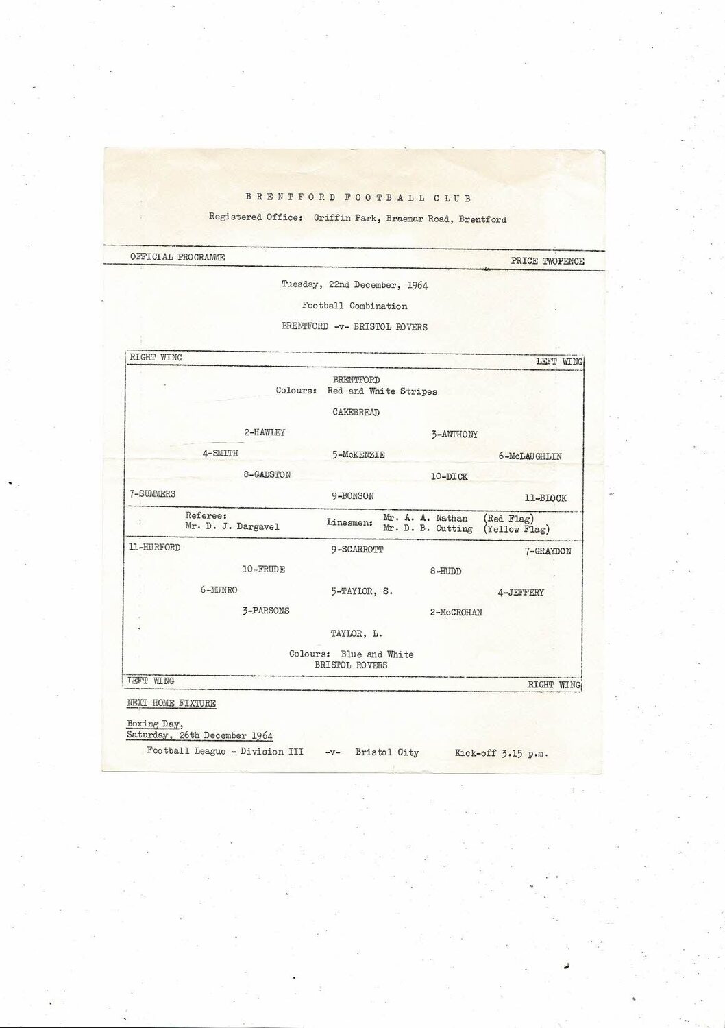 Brentford v Bristol Rovers Football Combination Programme 1964/65