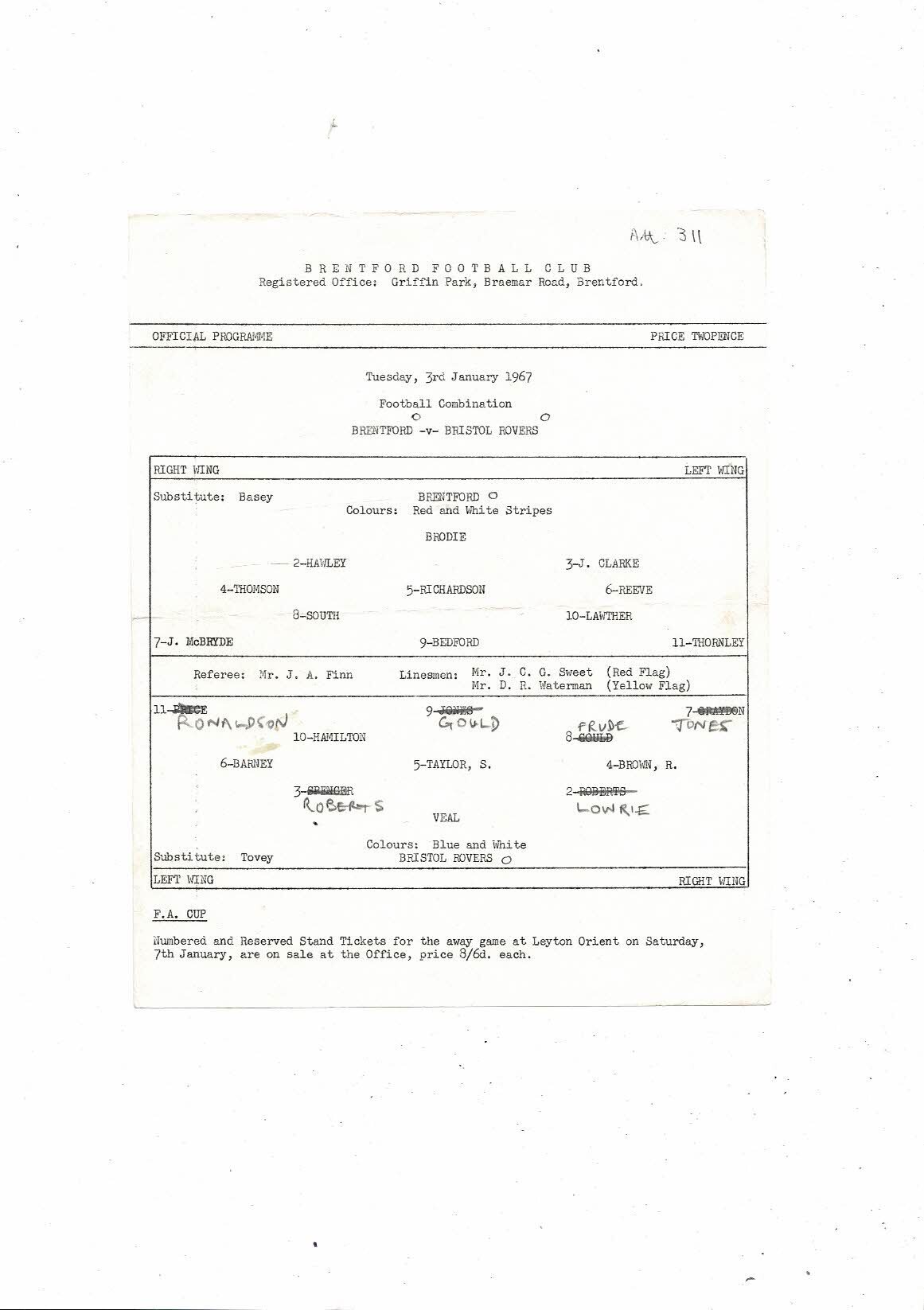Brentford v Bristol Rovers Football Combination Programme 1966/67