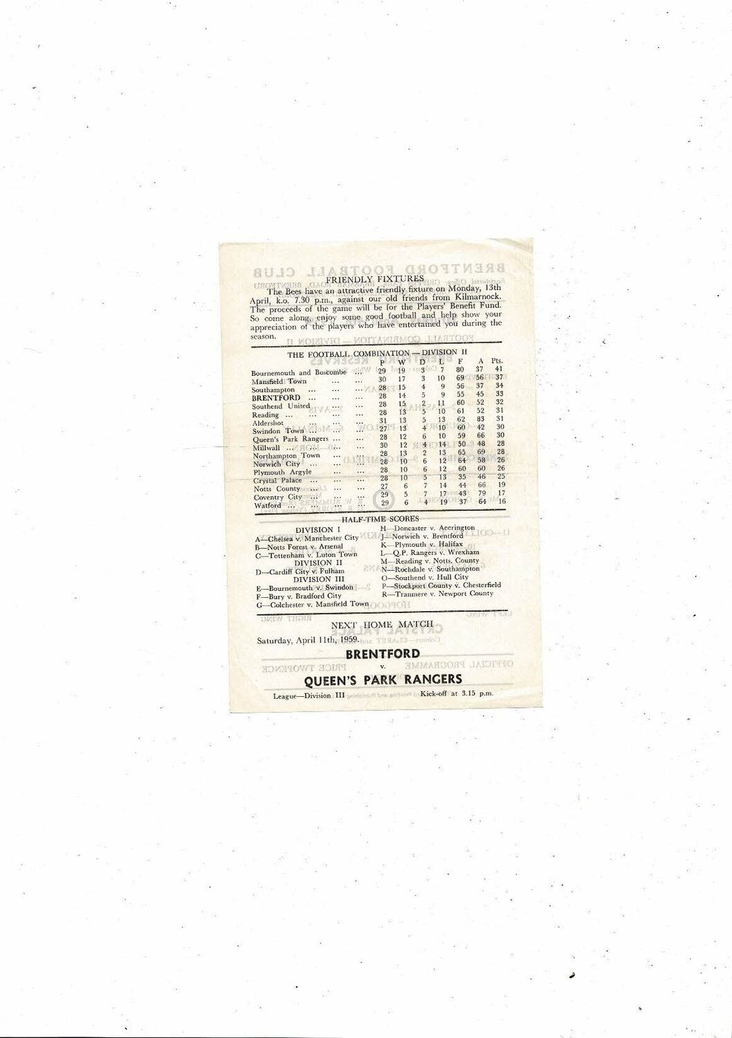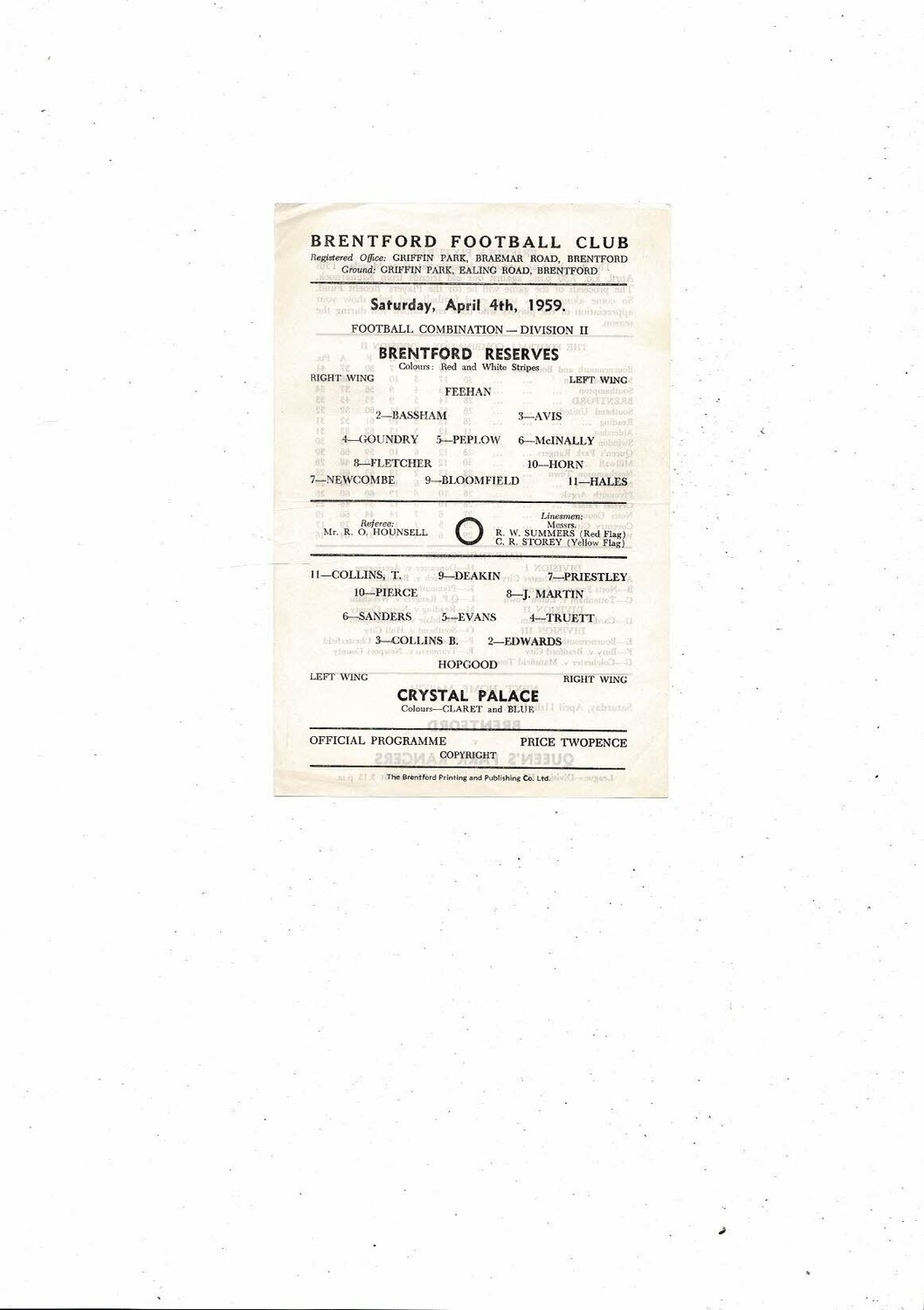 Brentford v Crystal Palace Football Combination Programme 1958/59