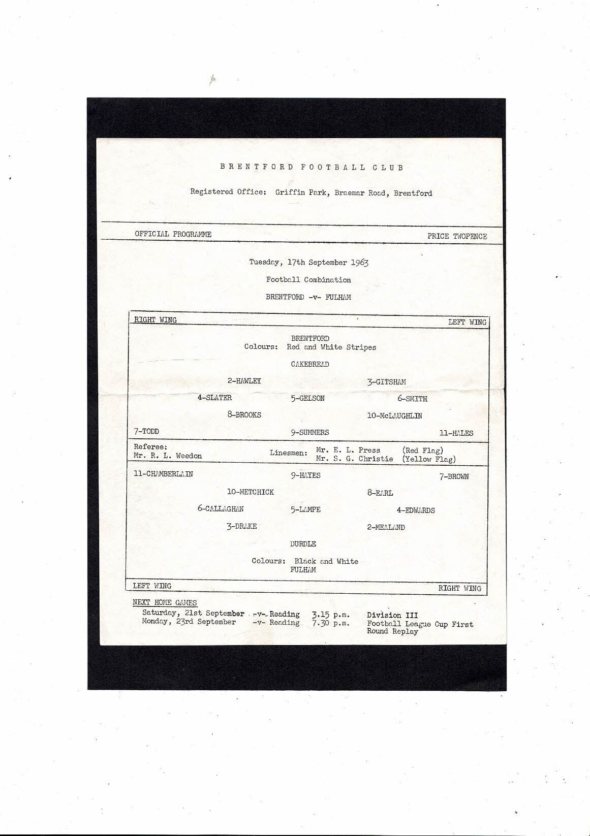 Brentford v Fulham Football Combination Programme 1963/64