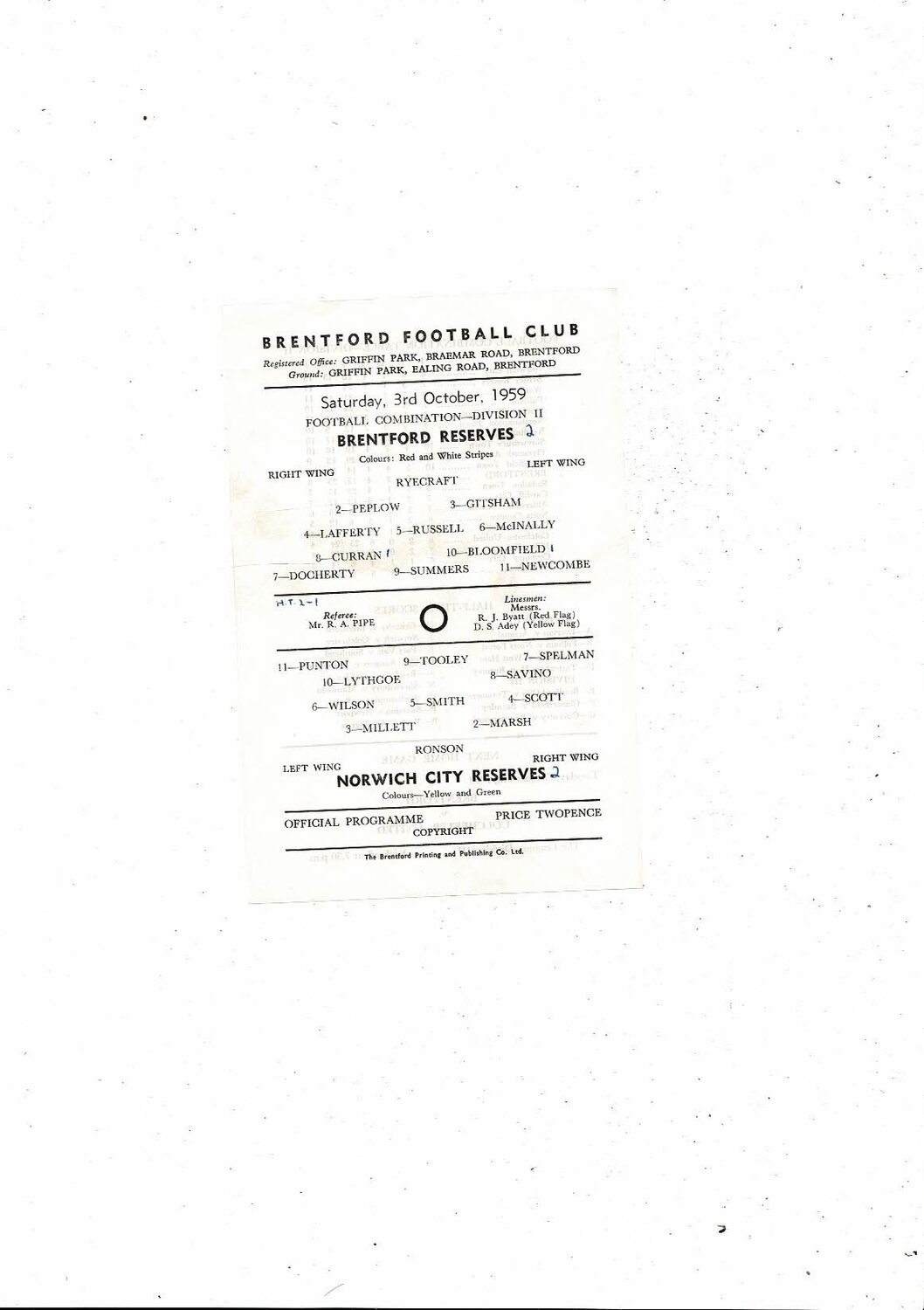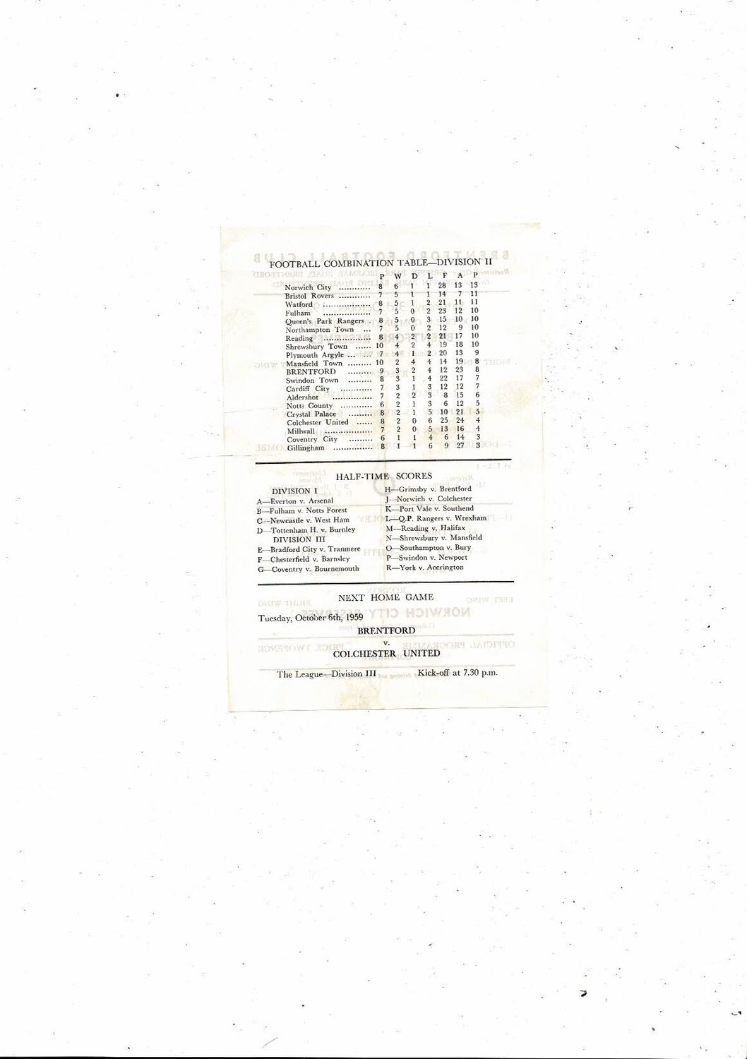 Brentford v Norwich City Football Combination Programme 1959/60