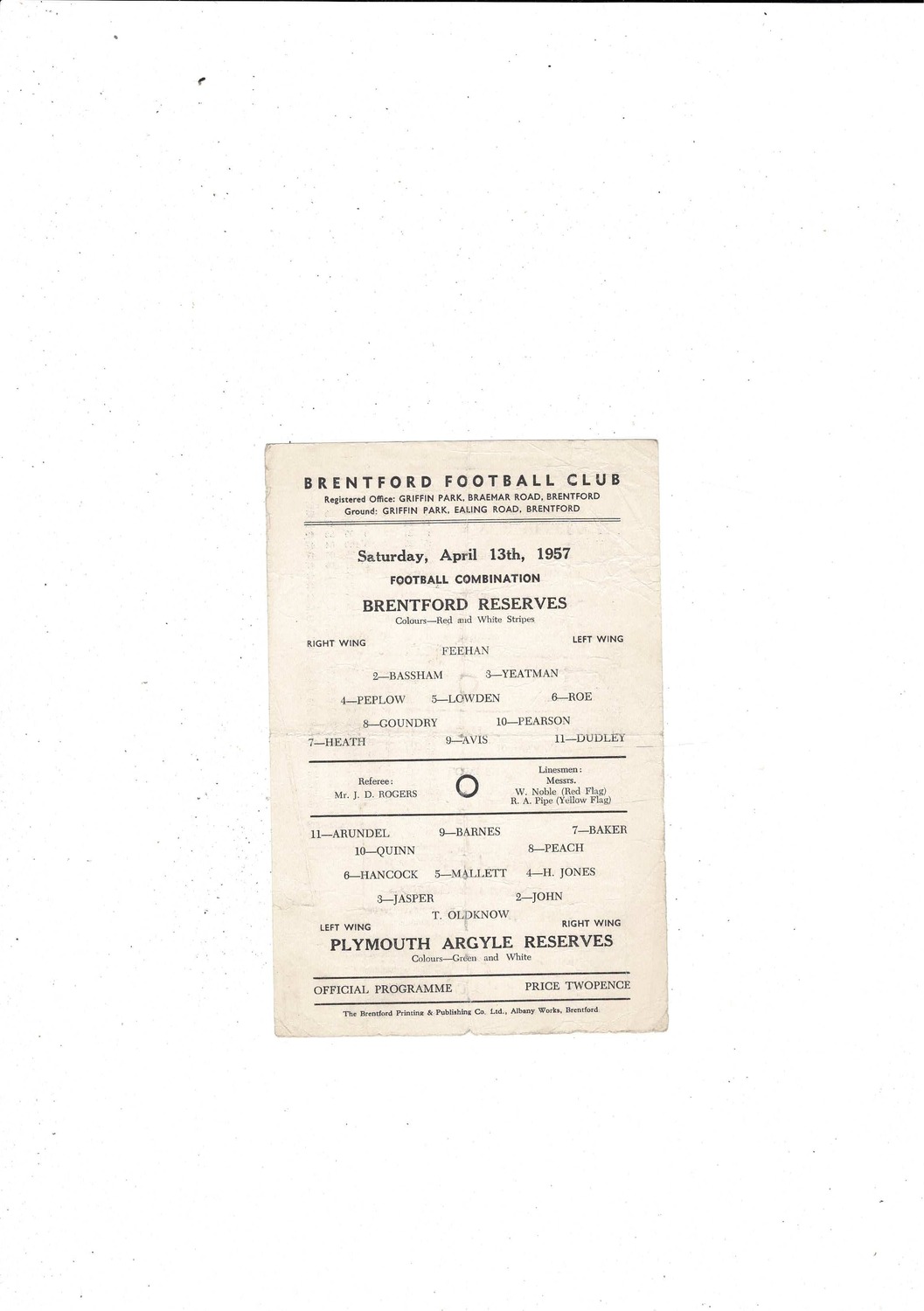 Brentford v Plymouth Argyle Football Combination Programme 1956/57