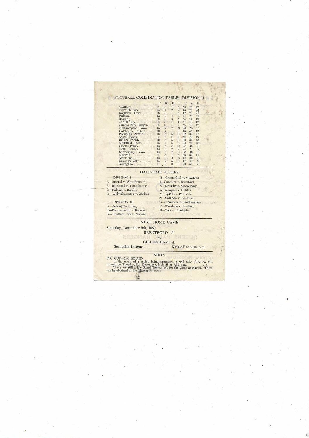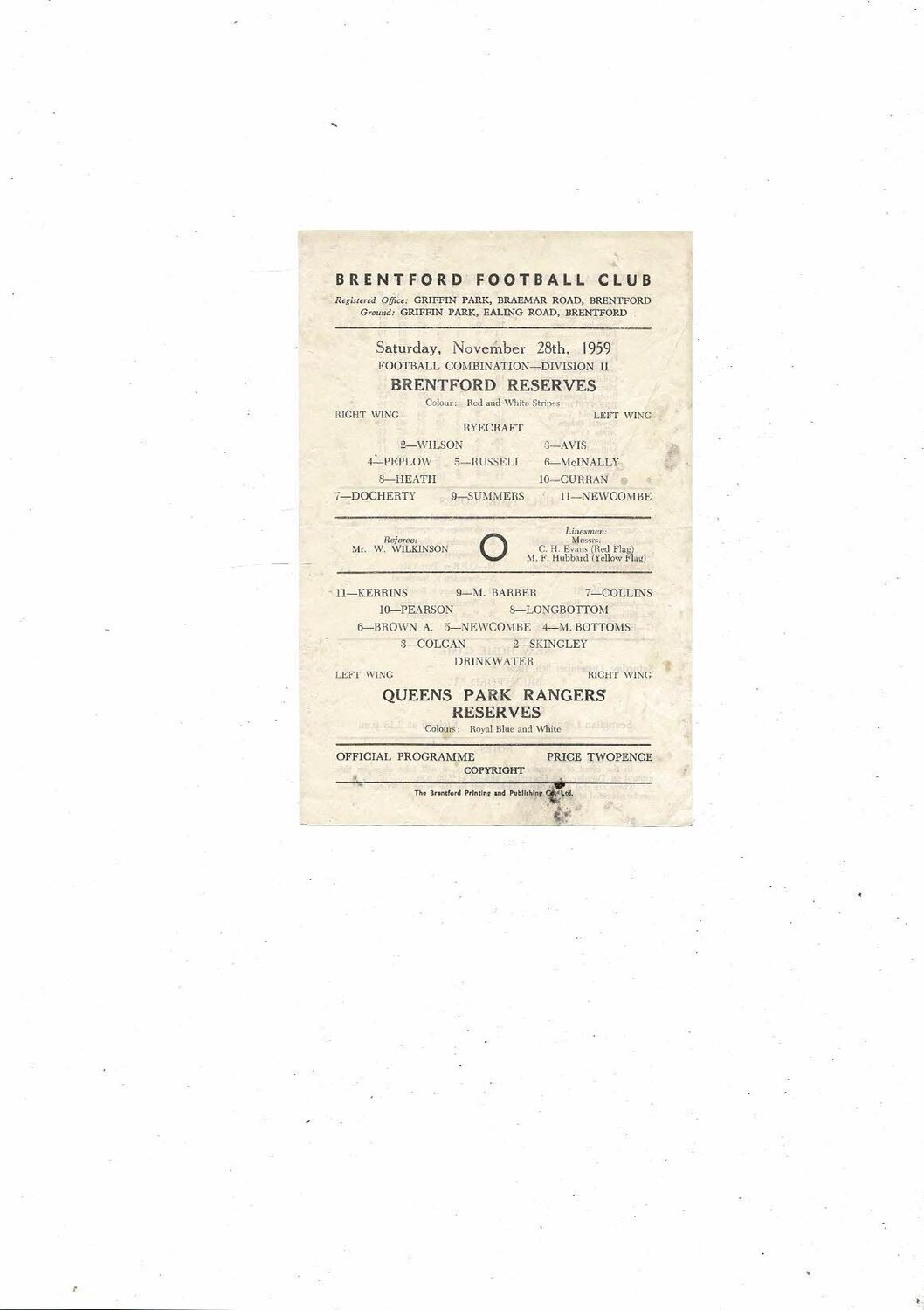 Brentford v Queens Park Rangers Football Combination Programme 1959/60