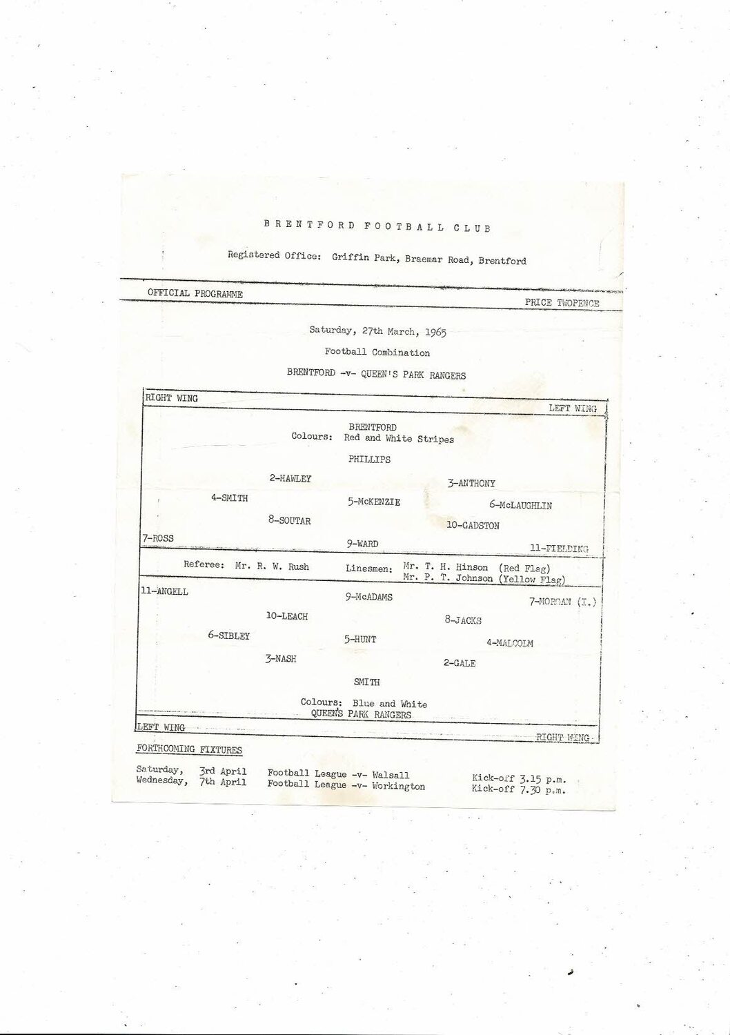 Brentford v Queens Park Rangers Football Combination Programme 1964/65
