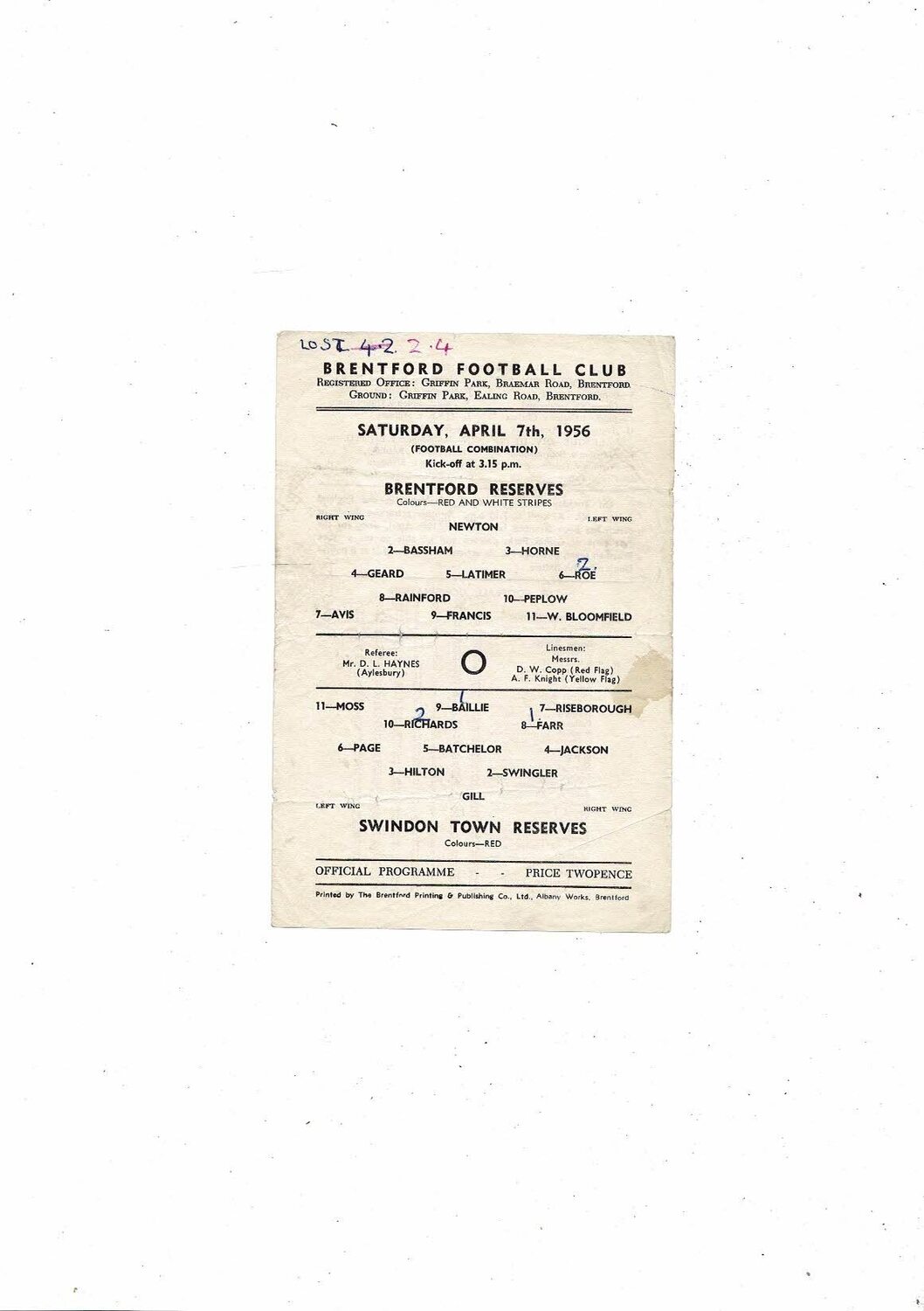 Brentford v Swindon Town Football Combination Programme 1955/56