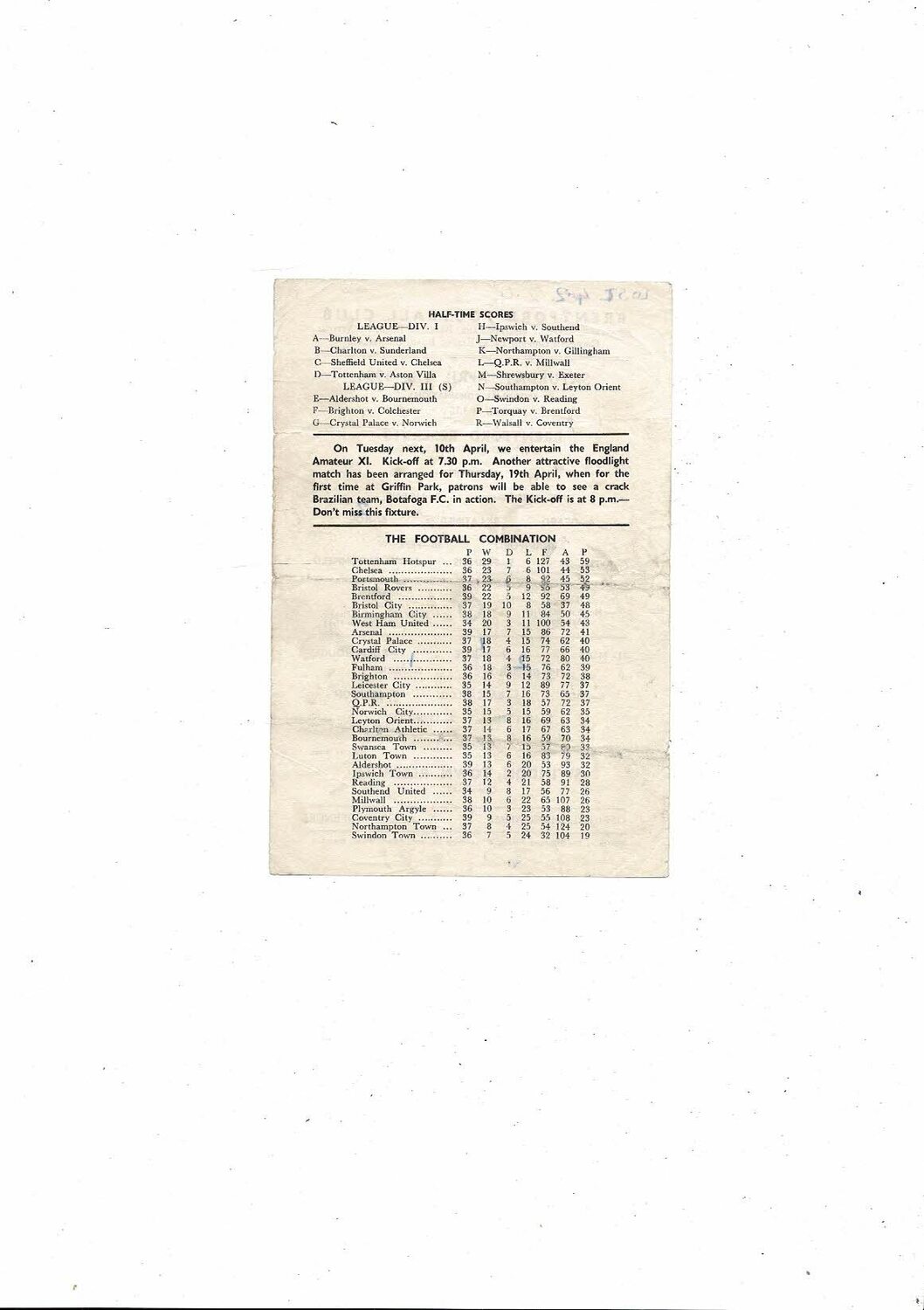 This original single sheet Football Programme is creased & folded with some staining, a couple of small tears, score & scorers noted. Please see scans.