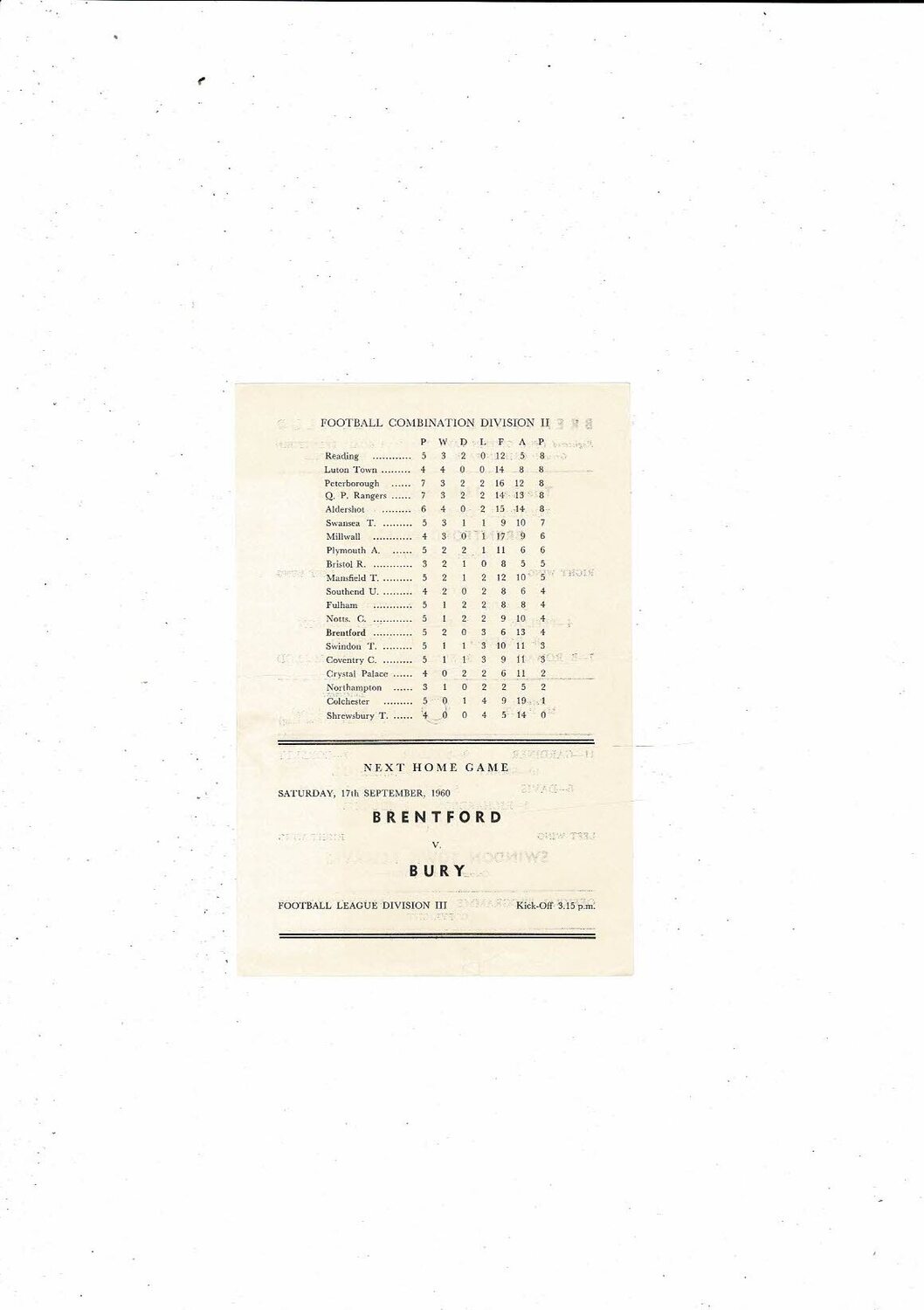 Brentford v Swindon Town Football Combination Programme 1960/61