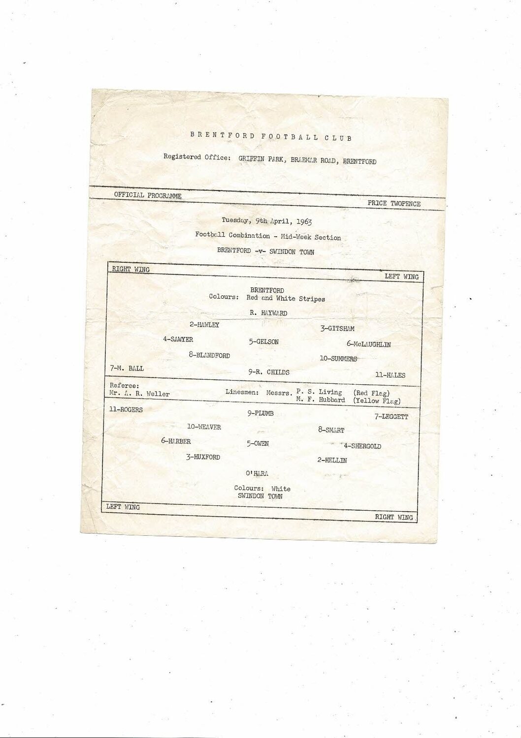 Brentford v Swindon Town Football Combination Programme 1962/63