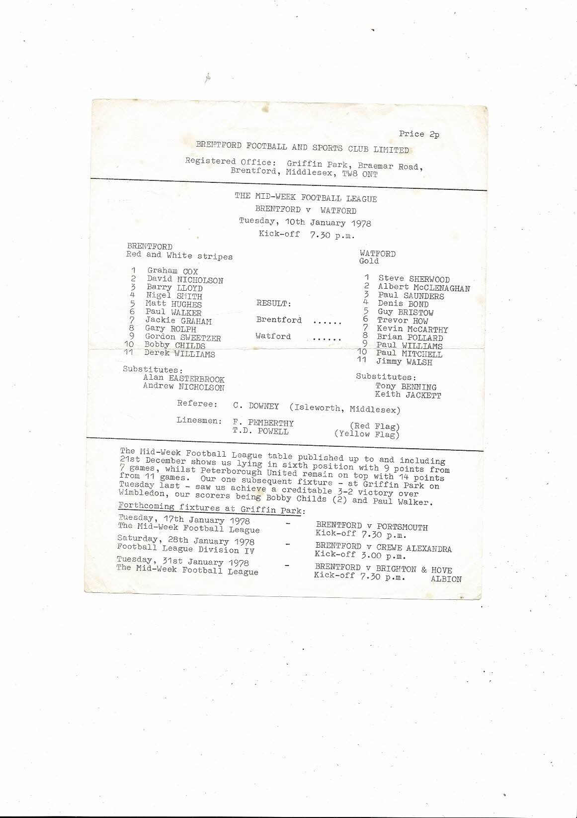 Brentford v Watford Mid-Week League Football Programme 1977/78
