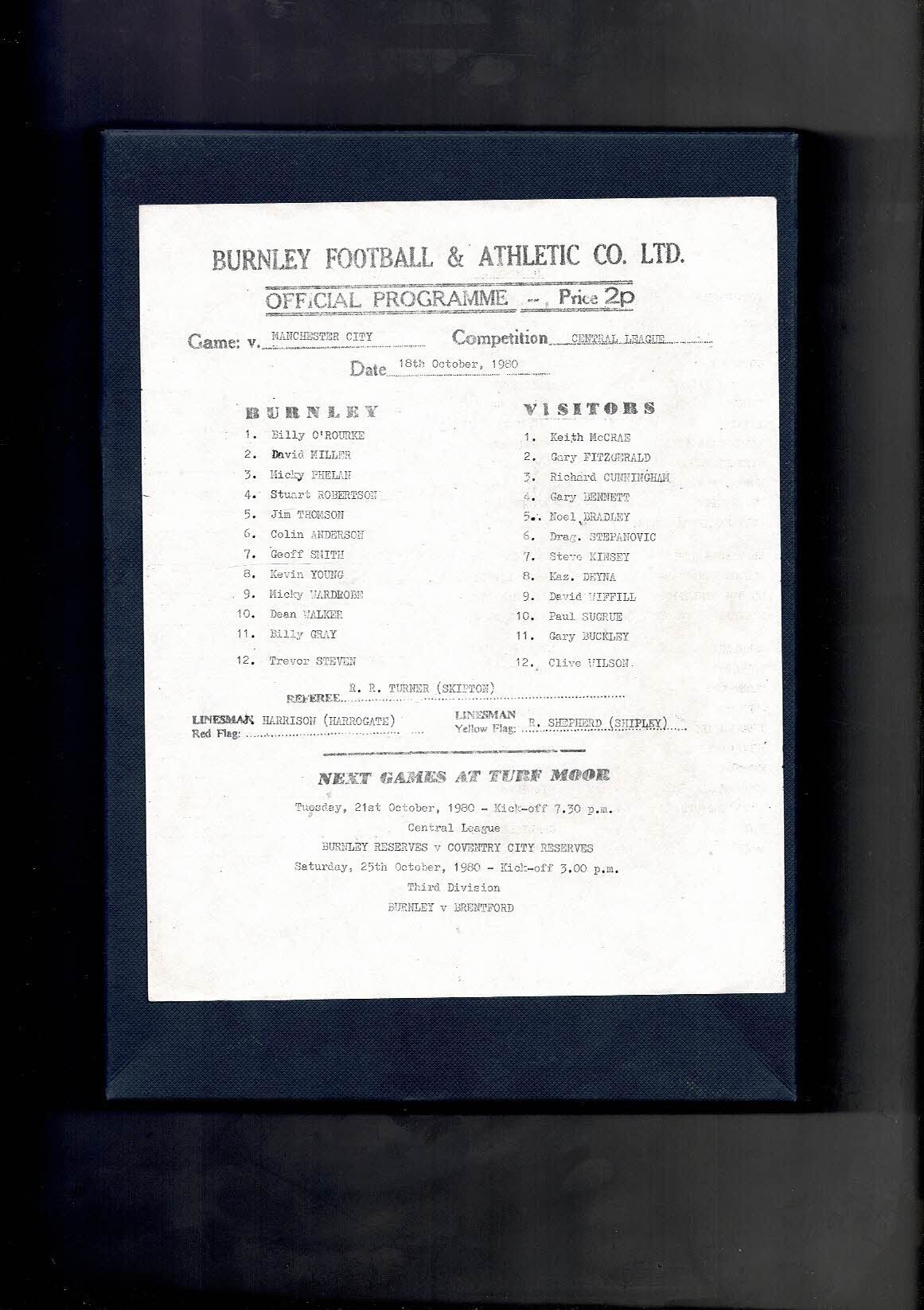 Burnley v Manchester City Central League Football Programme 1980/81