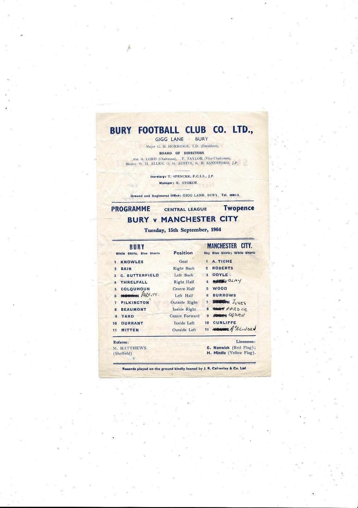 This Original single sheet Football Programme is creased & folded with some staining, tiny hole, tiny nic on edge & team changes. Please see scans.