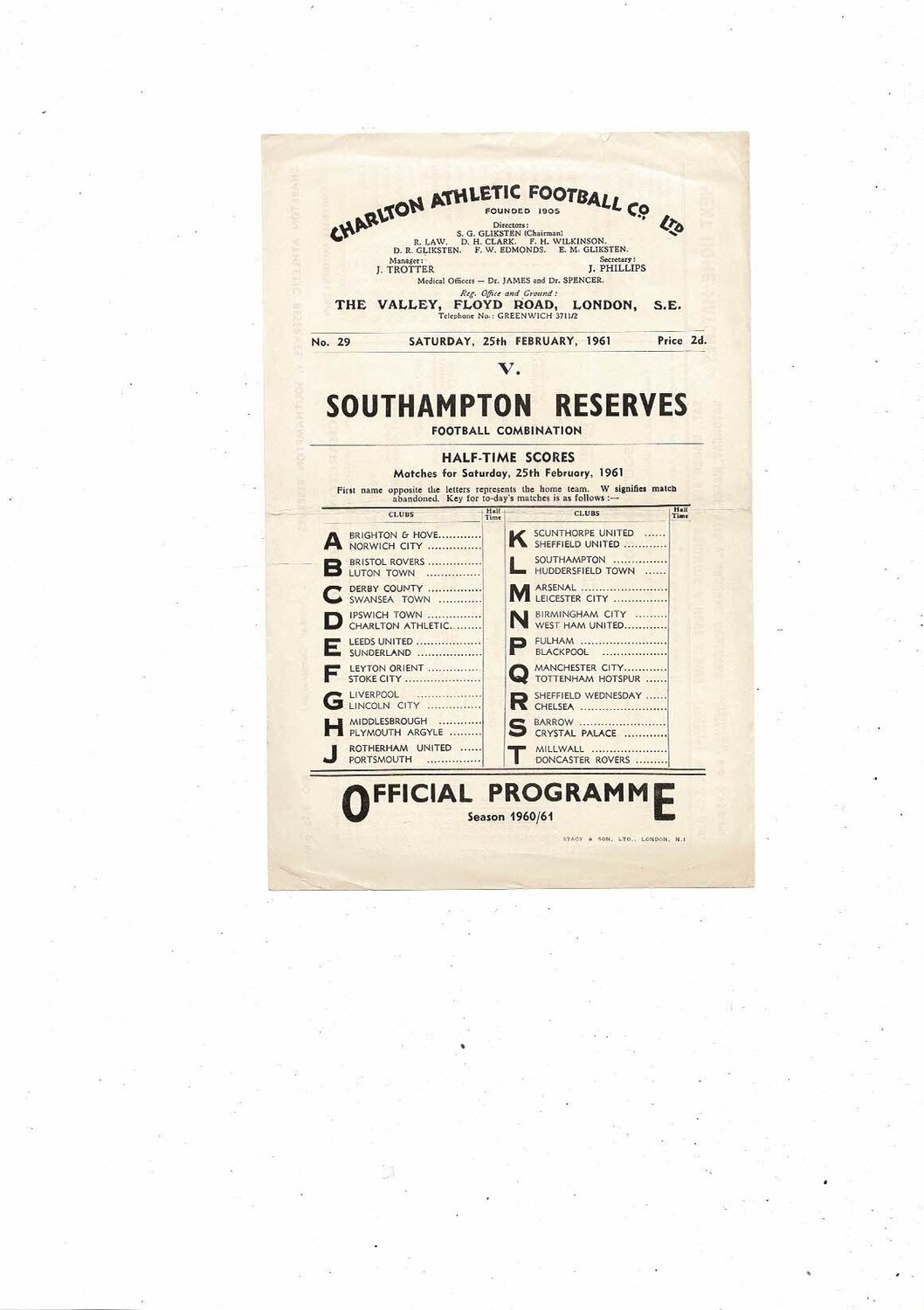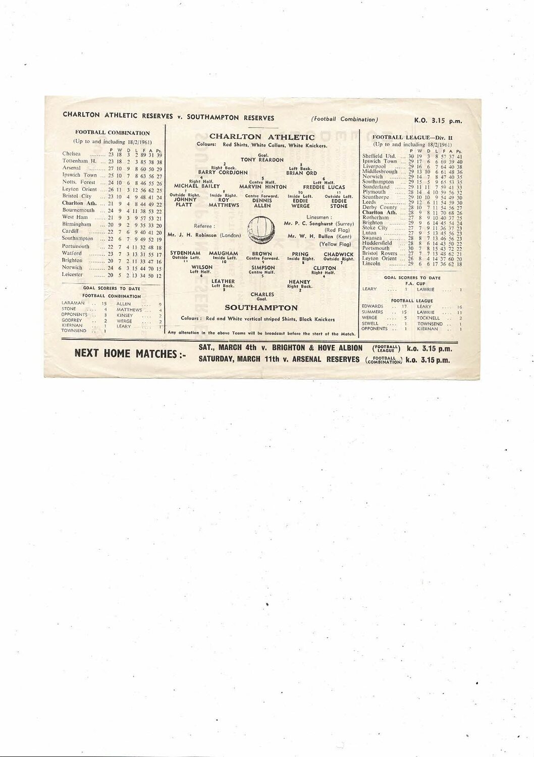 Charlton Athletic v Southampton Football Combination Programme 1960/61