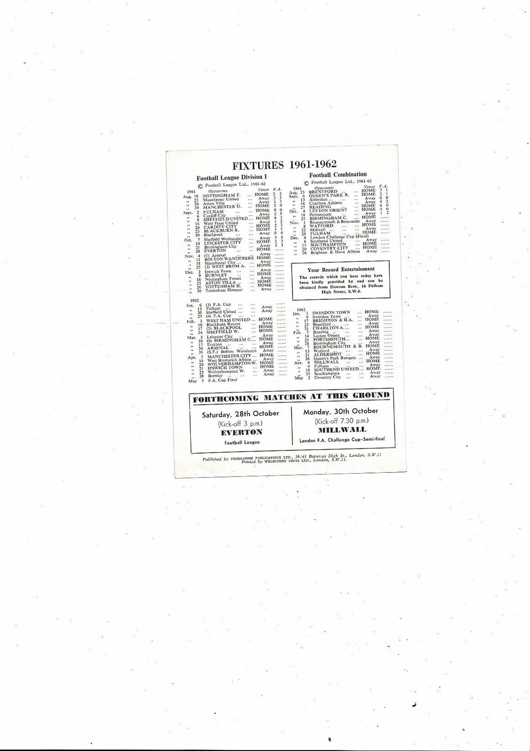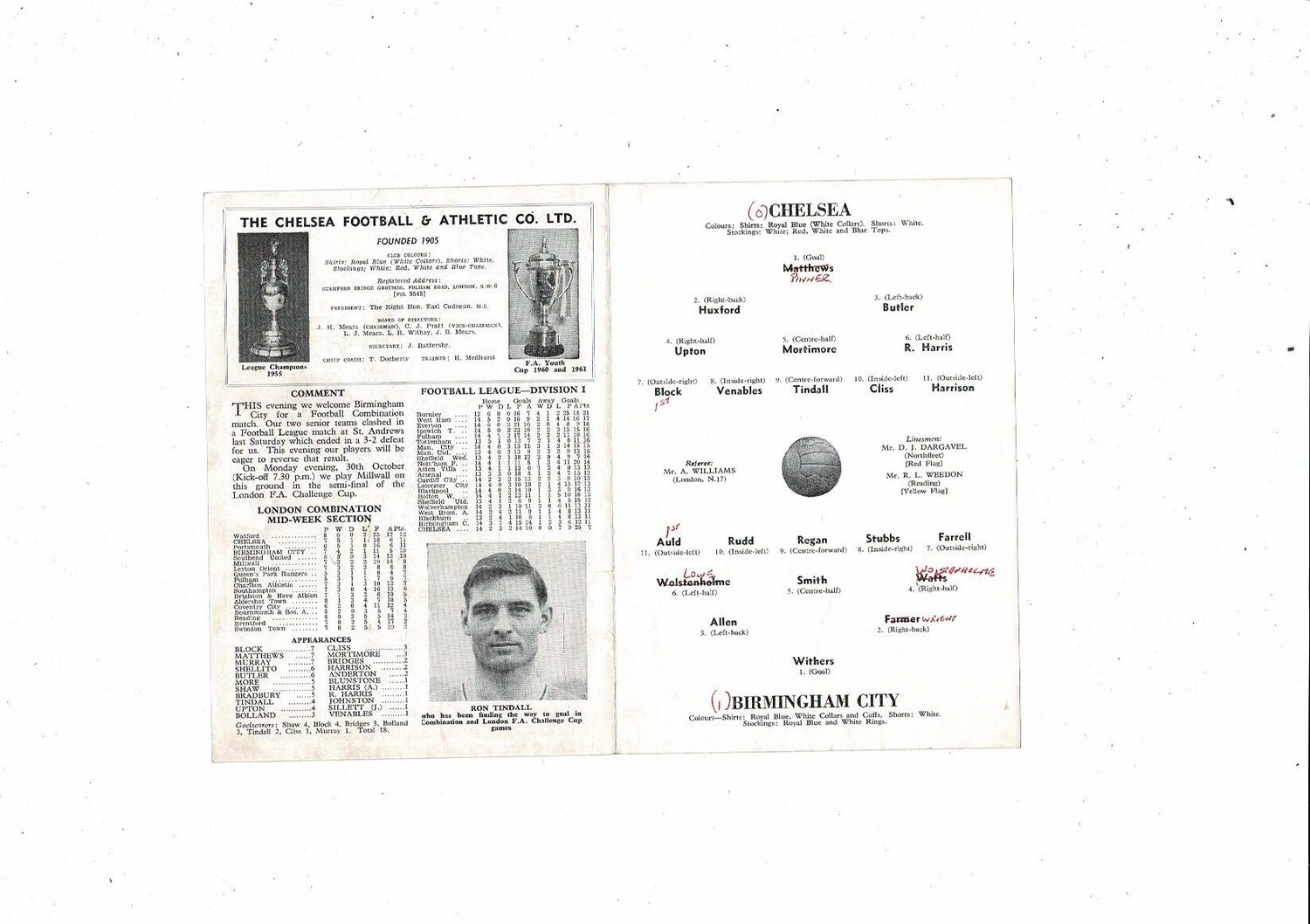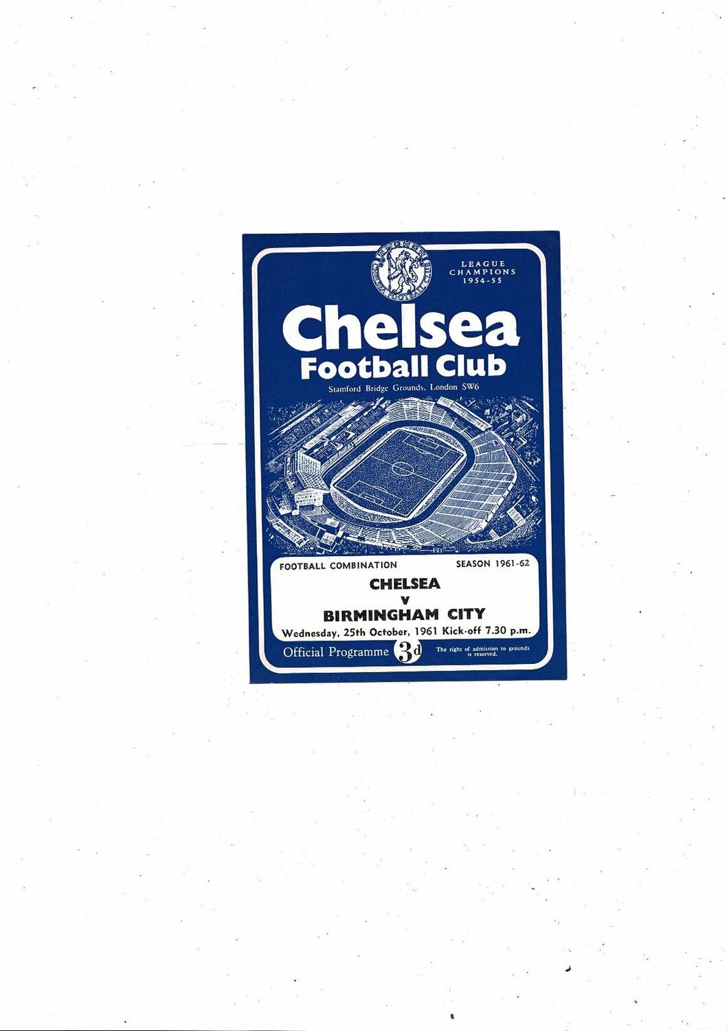 Chelsea v Birmingham City Football Combination Programme 1961/62